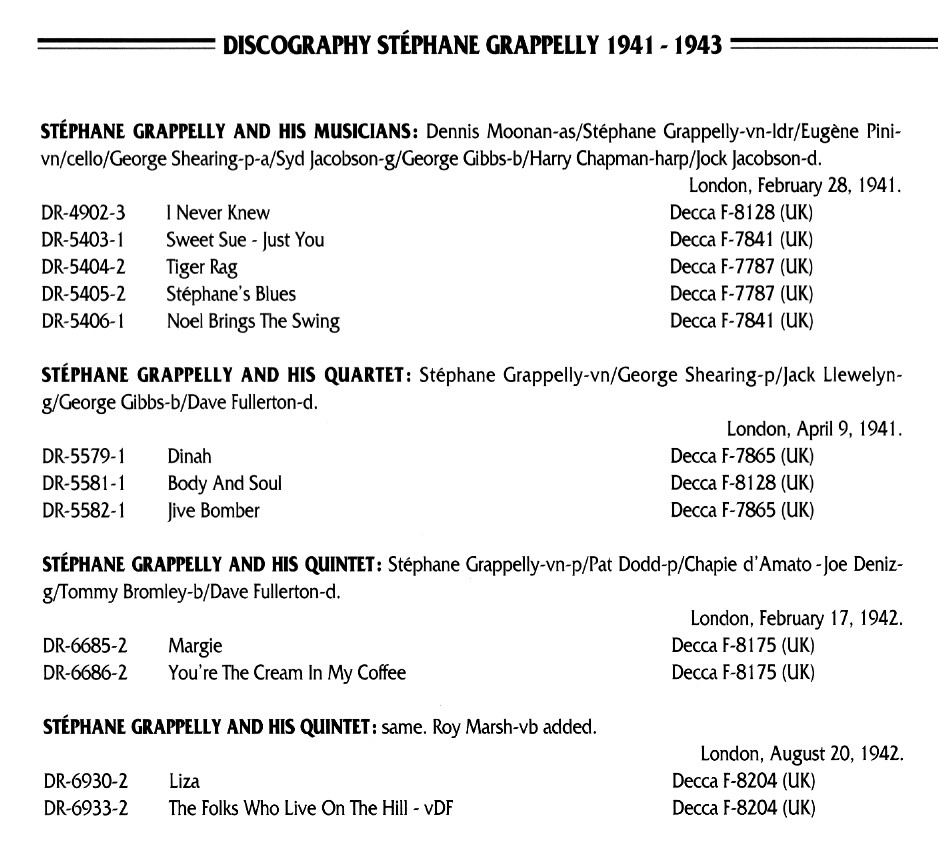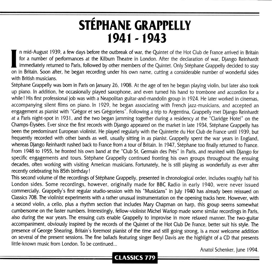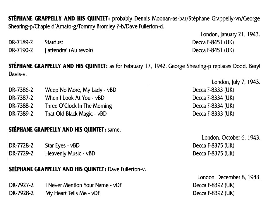 In England gründete Grappelli eine neue Band mit dem jungen Pianisten George Shearing, die aus Arthur Youngs Swingtette hervorging. Mit Reinhardt arbeitete er erst nach dem Krieg wieder zusammen, ohne jedoch Bandmitglied zu werden.