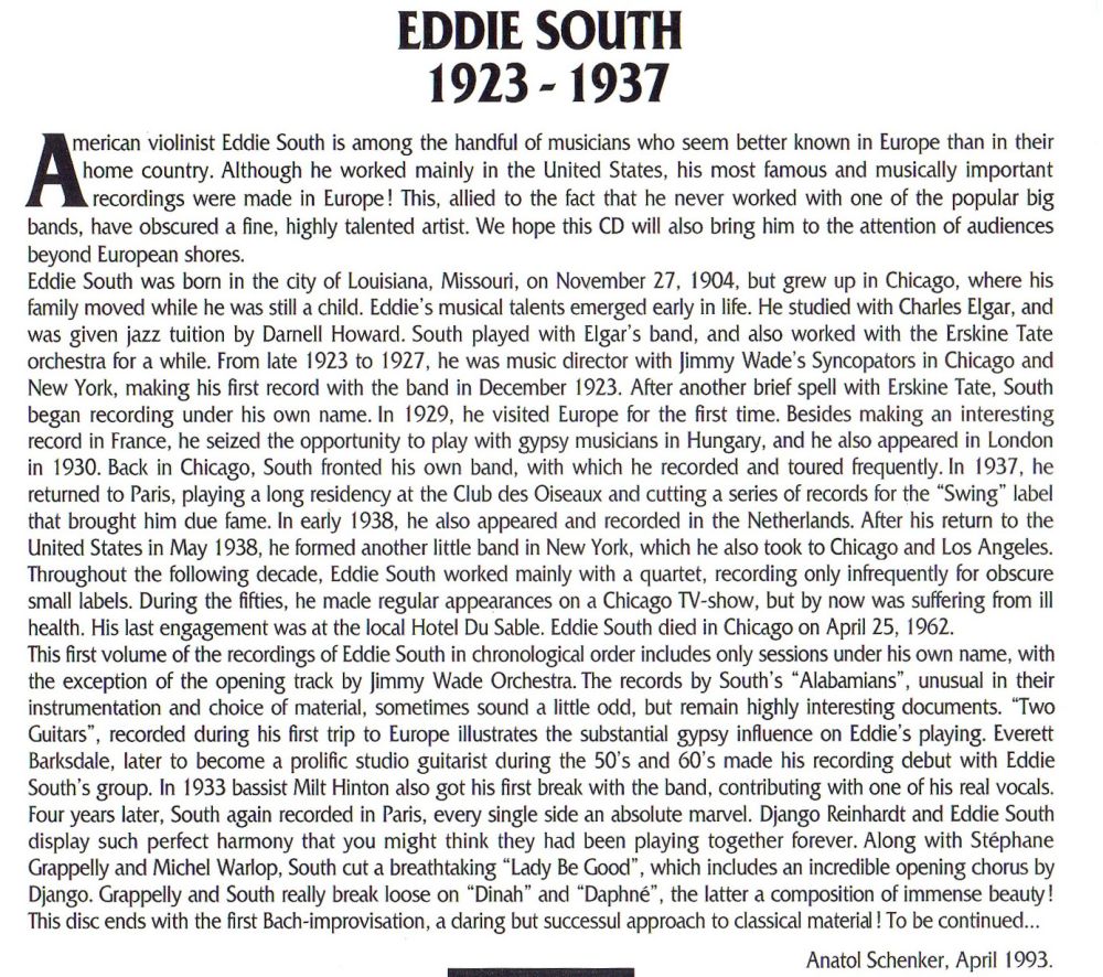 Eddie South (* 27. November 1904 in Louisiana/Missouri; + 25. April 1962 in Chicago) war ein US-amerikanischer Geiger. South galt als musikalisches Wunderkind und als brillanter Geigenspieler erhielt er am Chicago Musical College (1867 von Florenz Ziegfeld senior gegründet) eine klassische Ausbildung auf der Violine. Er wurde jedoch zwangsläufig Opfer des in Amerika vorherrschenden Rassismus und wandte sich der Musik zu, als er keine konzertierte Anstellung bekommen konnte. Aufgrund der limitierten Auftrittsmöglichkeiten für Afroamerikaner in diesem Bereich wandte er sich der Jazz-Musik zu. Zunächst spielte er in Vaudeville-Orchestern, die offen für Jazz-Einflüsse waren, insbesondere bei Freddie Keppard, Jimmy Wade, Charles Elgar und Erskine Tate.