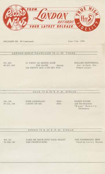 ?? 58....45-RO. 181....THE BUNKHOUSE BOYS vocal by GERRY MYERS..The French Song (Ro-369)/Take Me Back Into Your Heart (Ro-370)
