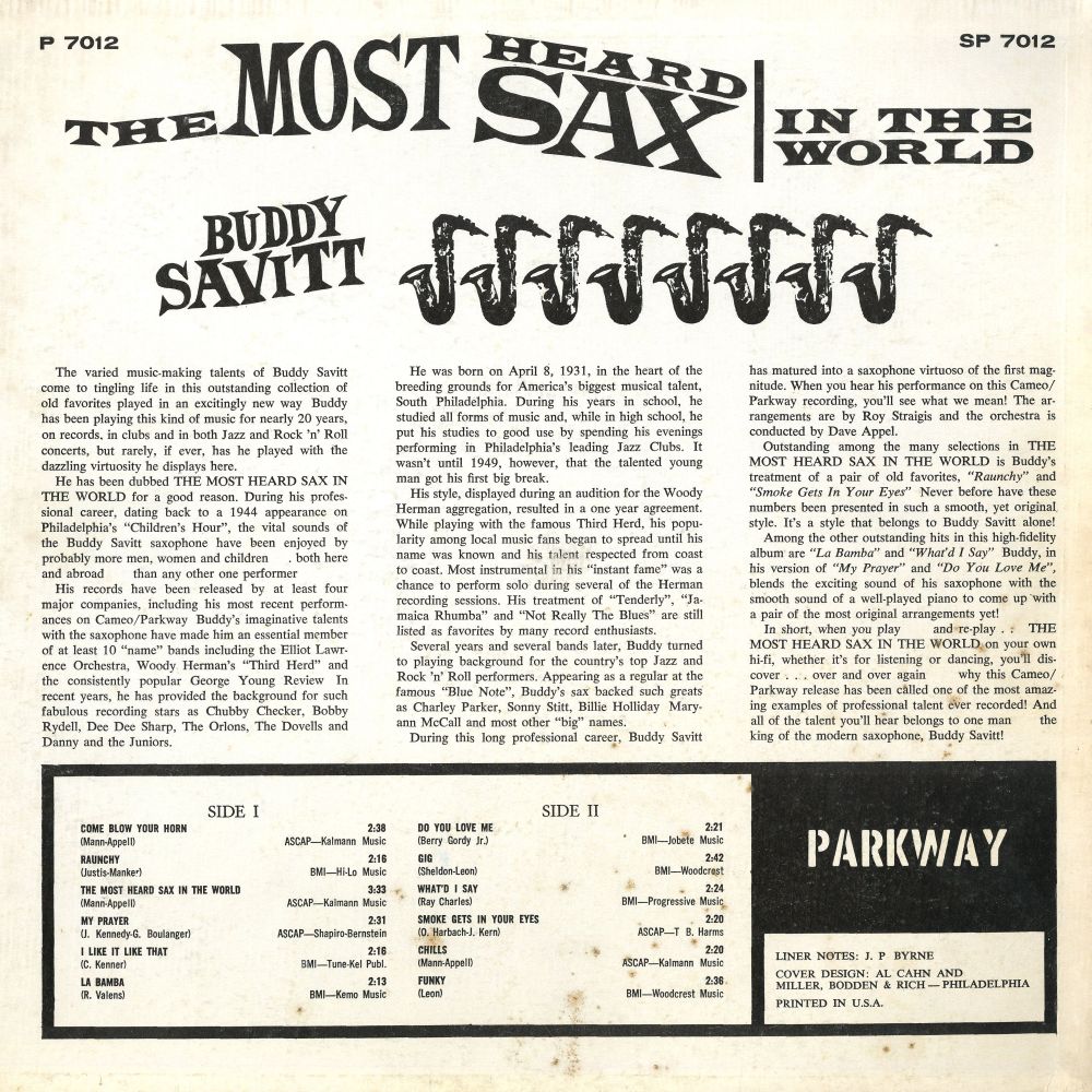 Im Gegensatz zu George Young** veröffentlichte Buddy nicht viele Songs unter seinem eigenen Namen. Es erschien lediglich eine Single, “Smoke Gets In Your Eyes“/“Come Blow Your Horn“ (Parkway 857, 1961), und eine LP, “Most Heard Sax In the World“ (Parkway SP-7012, 1962). Offenbar war Savitt in dieser Zeit exklusiv bei Cameo-Parkway unter Vertrag, da er bei keinen Sessions für andere Philadelphia-Labels wie Swan und Chancellor mitwirkte.