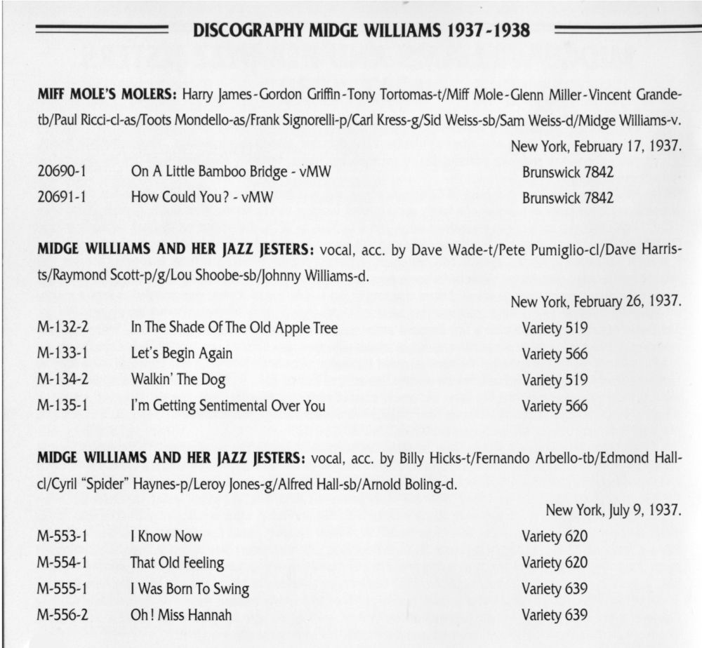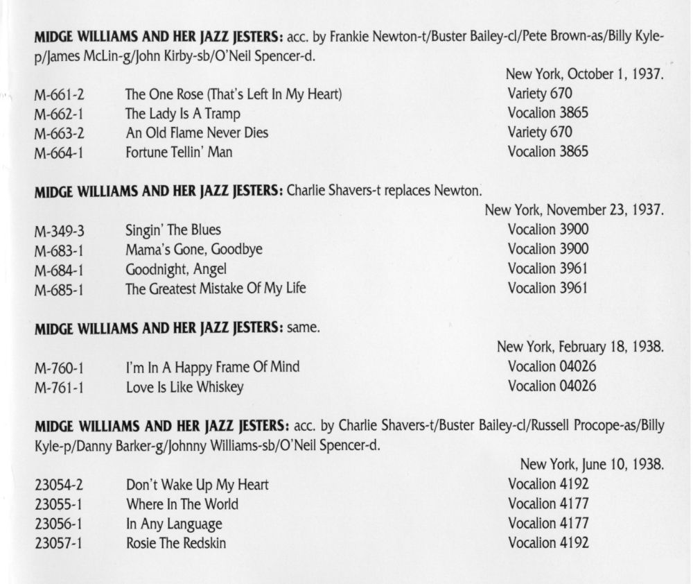 Die Sängerin gab sich nicht immer damit zufrieden, Sängerin in einer fremden Band zu sein, egal wie bekannt deren Namen waren, und so leitete sie auch ihre eigene Gruppe namens Midge Williams & Her Jazz Jesters. Für die Unterstützung bei ihrem amerikanischen Debütalbum sorgte niemand Geringeres als die Raymond Scott Combo.