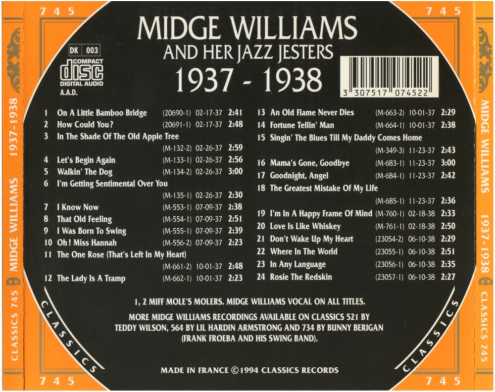 Ab Mitte 1936 begann Williams ihre amerikanische Aufnahmekarriere bei verschiedenen Plattenlabels, und 1937 nahm sie bereits Songs mit ihrer Band Midge Williams and Her Jazz Jesters auf. Die Aufnahmen mit den Jazz Jesters bis 1938 enthalten eine erstklassige Band mit dem Pianisten Raymond Scott, Frankie Newton, Buster Bailey und Charlie Shavers und enthalten Titel wie “In the Shade of the Old Apple Tree“, “Let’s Begin Again“ und “Walkin’ the Dog“.