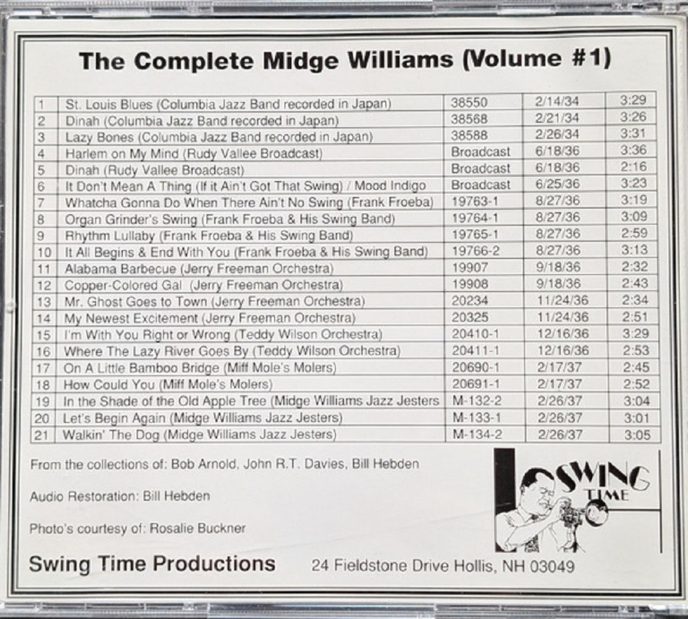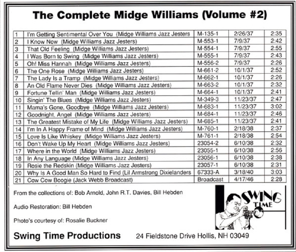 Virginia Louise "Midge" Williams (* 27. Mai 1915 in Portland (Oregon), + 09. Januar 1952 in San Francisco) war eine afroamerikanische Swing- und Jazz-Sängerin der 1930 er und 1940 er Jahre. Obwohl sie nicht so berühmt war wie andere Jazz-Musiker, war Williams eine angesehene Sängerin, und ihre Gruppe Midge Williams and Her Jazz Jesters nahm Ende der 1930 er Jahre mehrere erfolgreiche Aufnahmen für Vocalion unter eigenem Namen als auch mit der Band von John Kirby auf. Diese Periode stellt die Crème ihrer Diskographie dar.