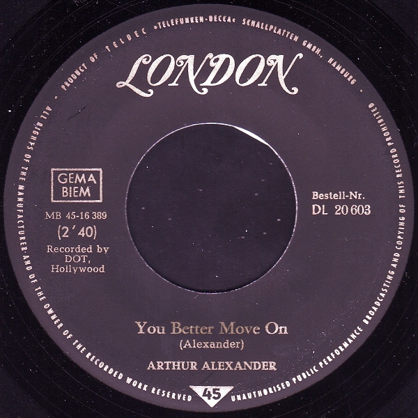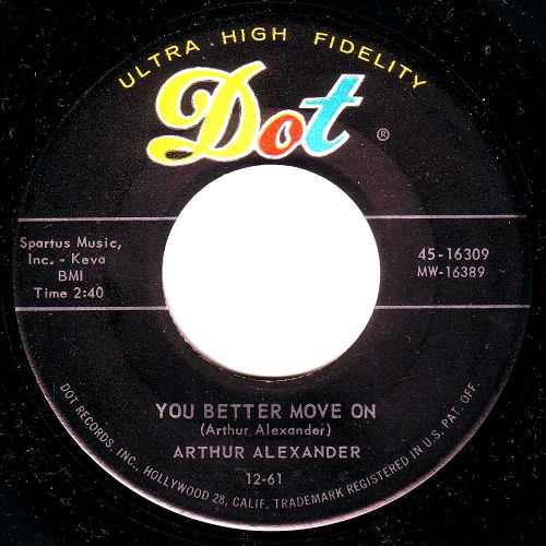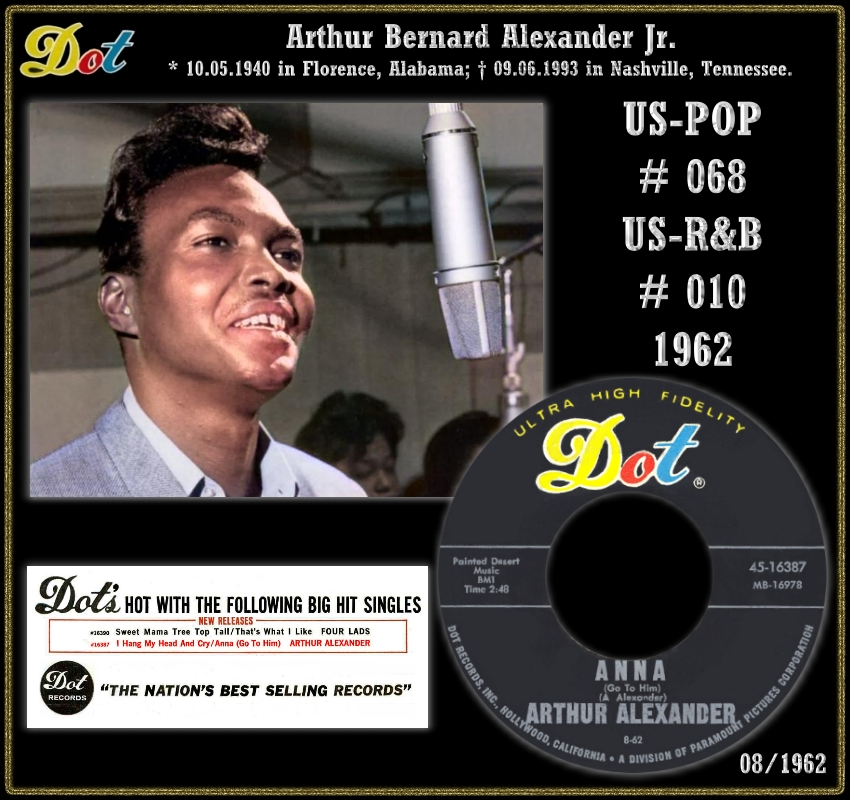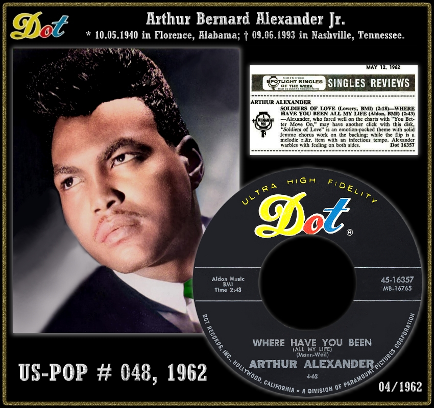wie's aussieht, gibt es "Alexander the Great" noch nicht im Forum. Zumindest seine Karriereanfänge gehören unter Rhythm & Blues. Als Songwriter darf er auch nicht übersehen werden! Die Stones coverten sein "You better move on" (Drafi Deutscher auch), die Beatles taten das gleich mehrfach: Anna, Soldier of Love. Steve Alaimo hatte 1962 großen Erfolg mit der Alexander Komposition "Everyday I have to cry". Auch Elvis Presley's Spätwerk "Burning Love" ist eine Coverversion des Arthur Alexander Originals.