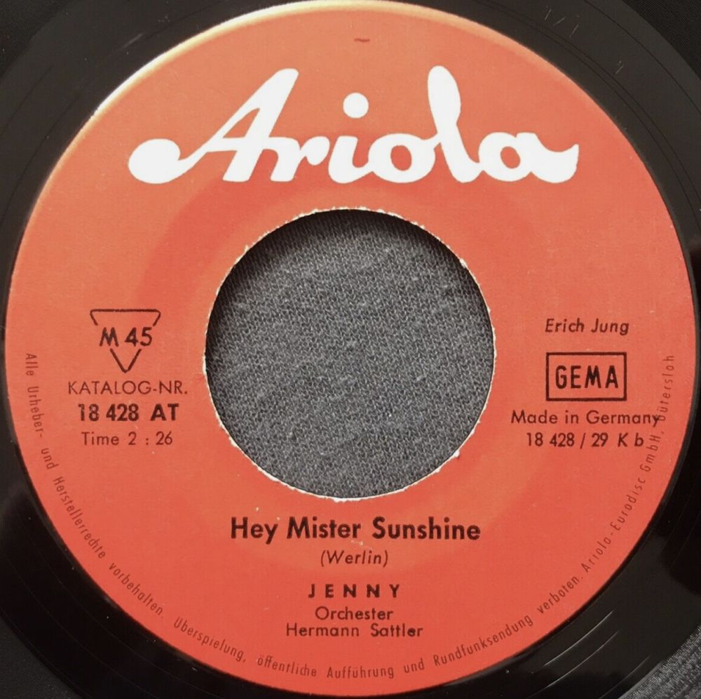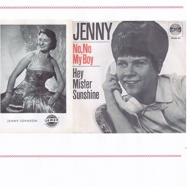 JOHNSON, JENNY (ISOLDE SCHALM–RENNER) * 16.03.1925, + 21.07.2014, Sängerin, Tempo (u.a. "Weiße Rosen Und Korallen"/"Steig In Das Traumboot Der Liebe" & FRED BERTELMANN, "Mambo-Ma"-1956, "Das Schönste Auf Der Welt Ist Doch Die Liebe"-1957, "Südwind", "Fahre Mit Mir In Die Ferne", "Goldener Ginster"-1957 & HARRY GRAF, "Cha, Cha Ballerina"-1957, "Laß’ Die Welt Darüber Reden"-1957 & Die KOLIBRIS, "Der Weiße Mond Von Maratonga"-1957, "Mi Casa, Su Casa"-1957, "Komm’ Ein Bischen Mit Nach Italien" u. "Sing, Baby, Sing"/"Eventuell, Eventuell"-1957 & FRED BERTELMANN, "Auf Meiner Kleinen Hacienda (My Adobe Hacienda)"-1958, "Eine Blaue Zauberblume"-1958, "Nur Du, Du, Du Allein"-1959, "Sweetheart, My Darling, My Dear"-1959 & Die PERRYS), Ariola (45002 "Wenn Die Anderen Schlafen"/"Die Tage Vergehen", 45023 "So Nicht Meine Herren" und Die "HAPPY DIXIELANDERS"/"Der Alte Sünder"- Die "HAPPY DIXIELANDERS"-solo), Heinerle Musik-Parade (62 Warte Niemals Auf Das Glück & Orch.: ERYK SOWA, 67 Ich Nenne Alle Frauen Baby als JENNY u. BOB & Die DIXIELÄNDER), Quellux (Tempo-Titel), Inhaberin des Union Studio in München