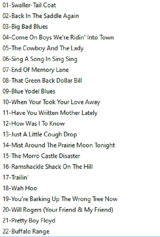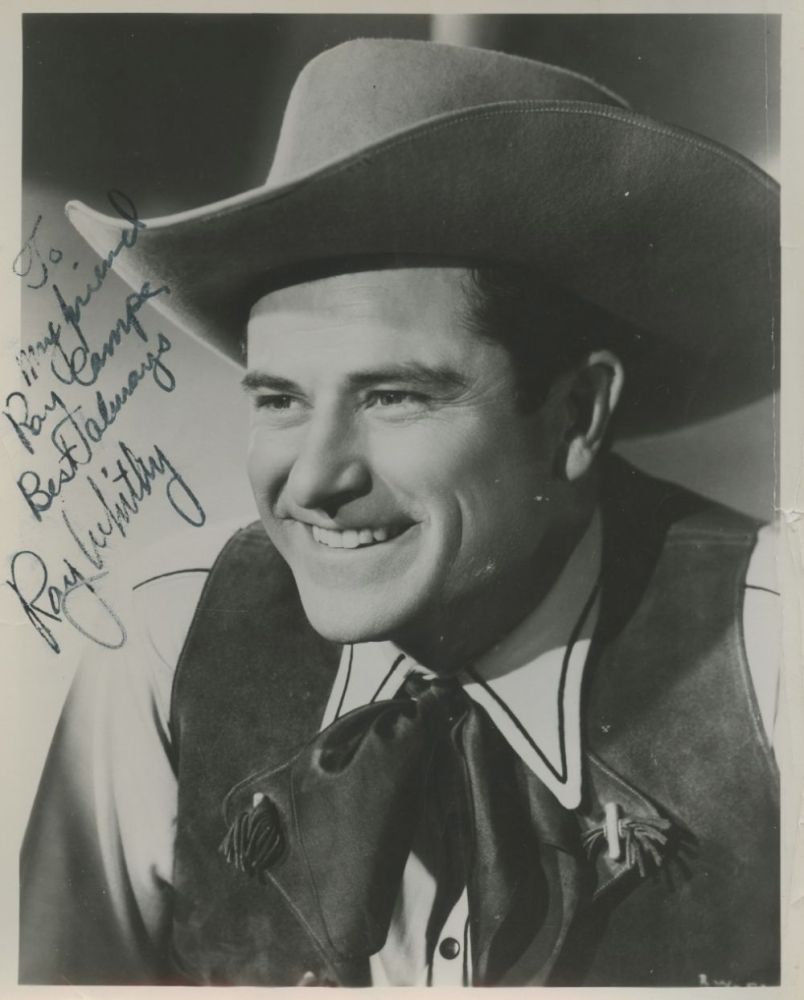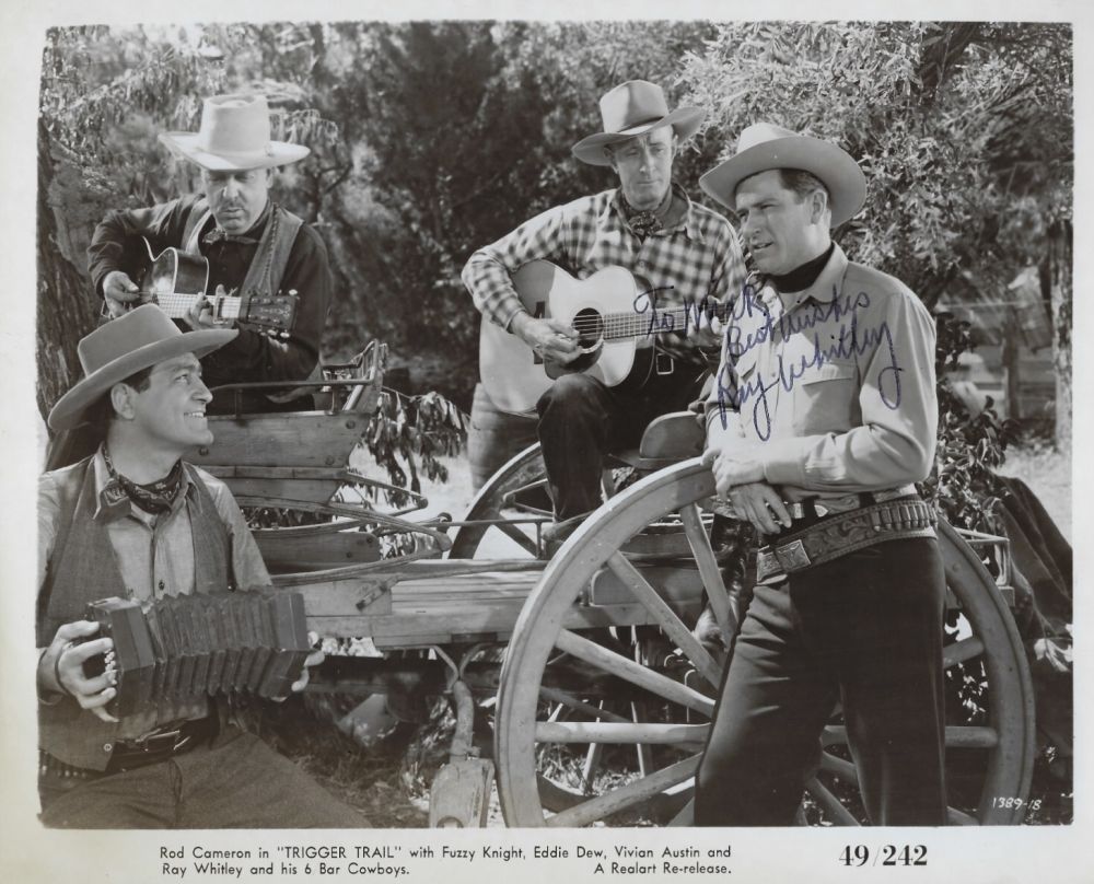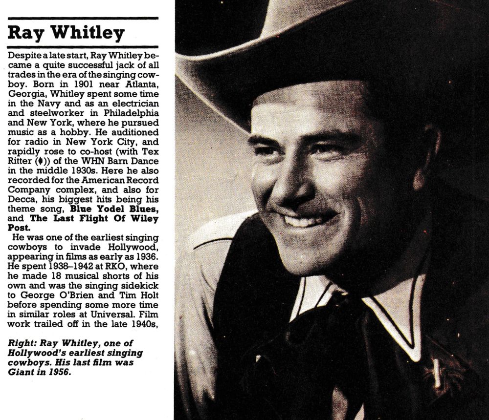 Ray Whitley, Singer/Songwriter, war einer der ersten Cowboy-Crooner Hollywoods. Im Gegensatz zu Gene Autry blieb er Nebendarsteller und spielte nie in einer eigenen Filmreihe mit, drehte jedoch Mitte der 1930 er Jahre zahlreiche Musical-Kurzfilme. Gemeinsam mit Fred Rose schrieb er auch einige von Autrys beliebtesten Songs, darunter “Back in the Saddle Again“ und “Ages and Ages Ago“. Der in Atlanta geborene Whitley spielte zunächst nur gelegentlich bei Gemeindeveranstaltungen, bis er Ende der 1920er Jahre Jimmie Rodgers entdeckte. Als ihn die Depression zu längerer Arbeitslosigkeit zwang, wandte er sich schließlich dem professionellen Auftritt zu; seine ersten Auftritte hatte er mit den Range Ramblers, später umbenannt in Six Bar Cowboys, die bis in die 1960 er Jahre beim World Championship Rodeo spielten.
