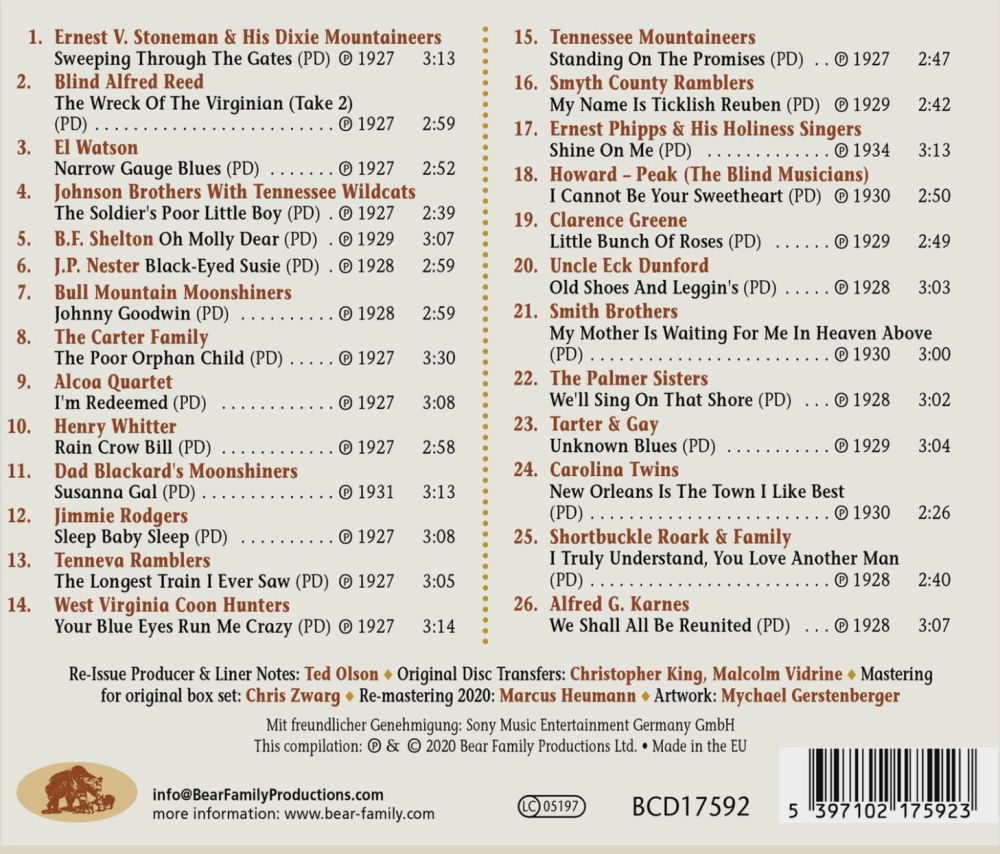 Zu dieser Zeit umwarb Peer auch den Mainstream-Popmarkt mit zukünftigen Dauerbrennern wie Hoagy Carmichaels “Georgia on My Mind“, und er zog auch nach Hollywood, wo er den Komponisten Leroy Shield engagierte, um Soundtracks für den Filmkomödienproduzenten Hal Roach zu schreiben. Doch die Depression drohte alles zu verändern – konkurrierende Labels wie Columbia gingen bankrott, und obwohl sich die melancholischen, tief empfundenen Appalachen-Balladen der Carter Family weiter verkauften, stand die Ehe von A.P. und Sara Carter am Rande des Zusammenbruchs. Jimmie Rodgers' Tod an Tuberkulose am 26. Mai 1933 läutete eindeutig das Ende einer Ära ein.