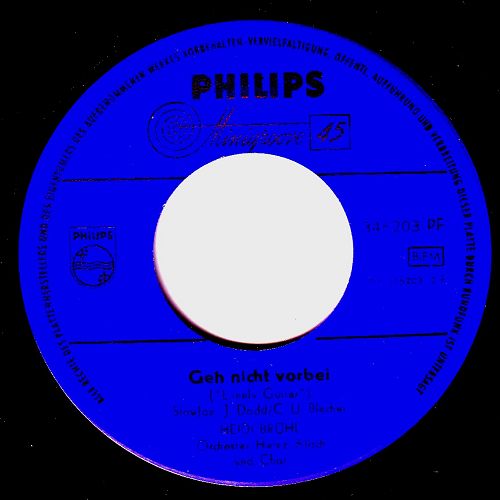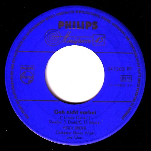 Auch vom Teenie-Star Annette gibt es einige Titel auf deutsch. "Lonely Guitar" ist zwar nicht so aufregend aber dafür das wunderschöne PHILIPS-blau, dass es in Wirklichkeit garnicht gibt. Ich habe so lange herumgedoktert, bis man den Text so halbwes lesen konnte und dabei ist dieses wunderbare Blau entstanden. Jetzt haumma di Annet vagessn. Annette Funicello, geb. am 22. Oktober 1942, hoppala, die ist genau zwei Tage älter als ich und jetzt ernstlich zu den Scans