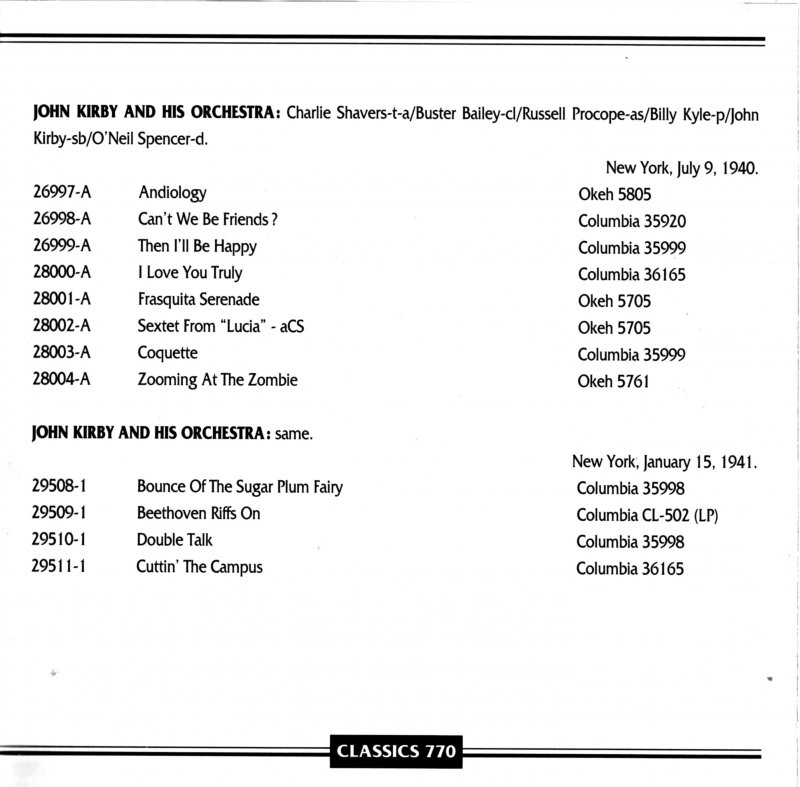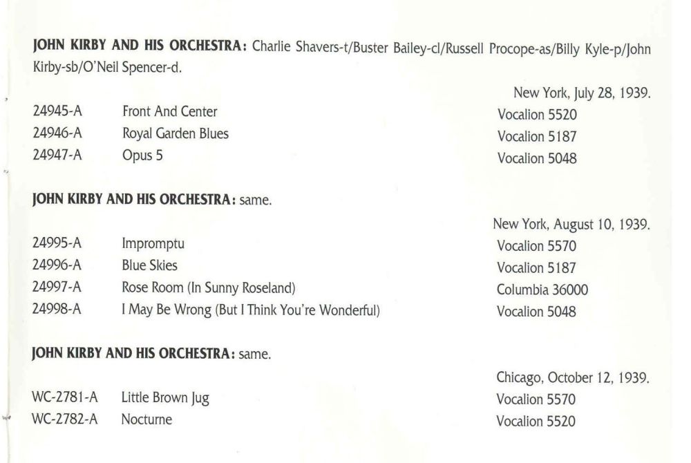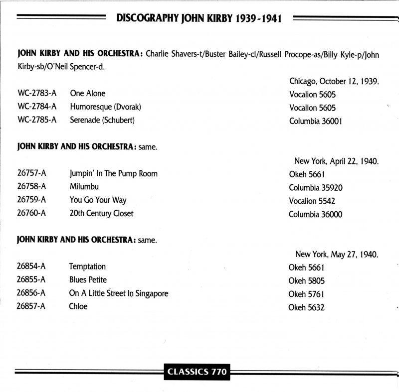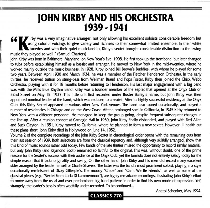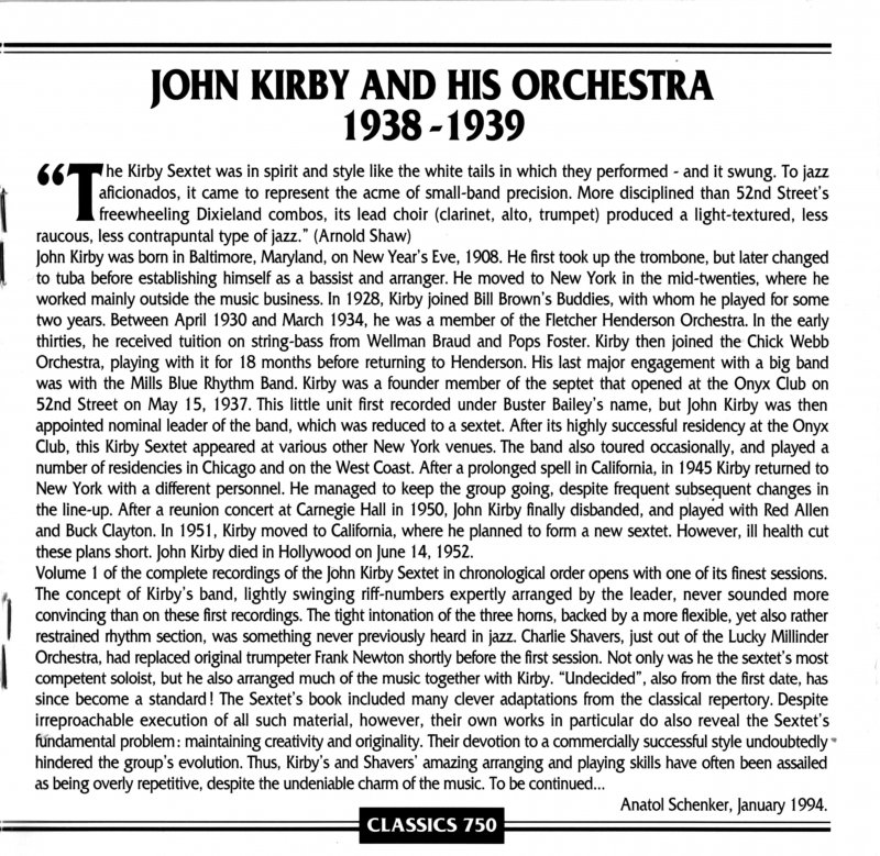 John Kirby bildete 1938 ein Ensemble, das in jeder Hinsicht Swingmusik im besten Sinn jener Zeit machte, aber gleichwohl eine Band in jenem Sinne war, wie er sich erst in den 50 er Jahren von selbst verstand. Sein präziser Ensemble-Stil nahm in Hinblick auf melodische Finesse und kammermusikalische Brillanz manches vorweg, was erst zwanzig Jahre später zum Inbegriff integrierten Jazz-Musizierens werden sollte. Mit John Kirby - und außerdem mit dem Nat King Cole-Trio – beginnt eine Linie, die über das Art Tatum-Trio und das Red Norvo-Trio zu all den charakteristischen Bands der 50 er und 60 er Jahre führt: dem Gerry Mulligan-Quartett, dem Modern Jazz Quartet, dem Jimmy Giuffre-Trio, dem Max Roach/Clifford Brown-Quintett, dem Miles Davis-Quintett, dem Horace Silver-Quintett, Art Blakeys Jazz Messengers, den Charles Mingus-Gruppen, den Ornette Coleman-Gruppen.