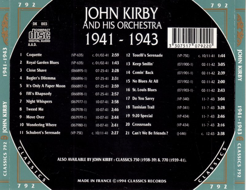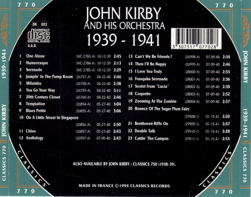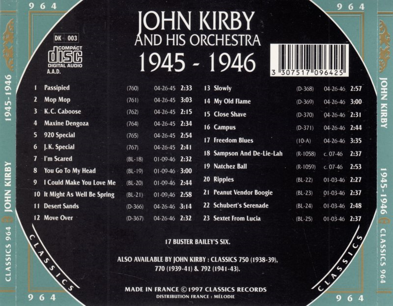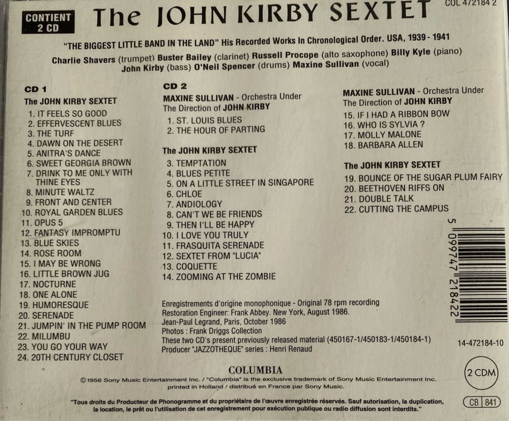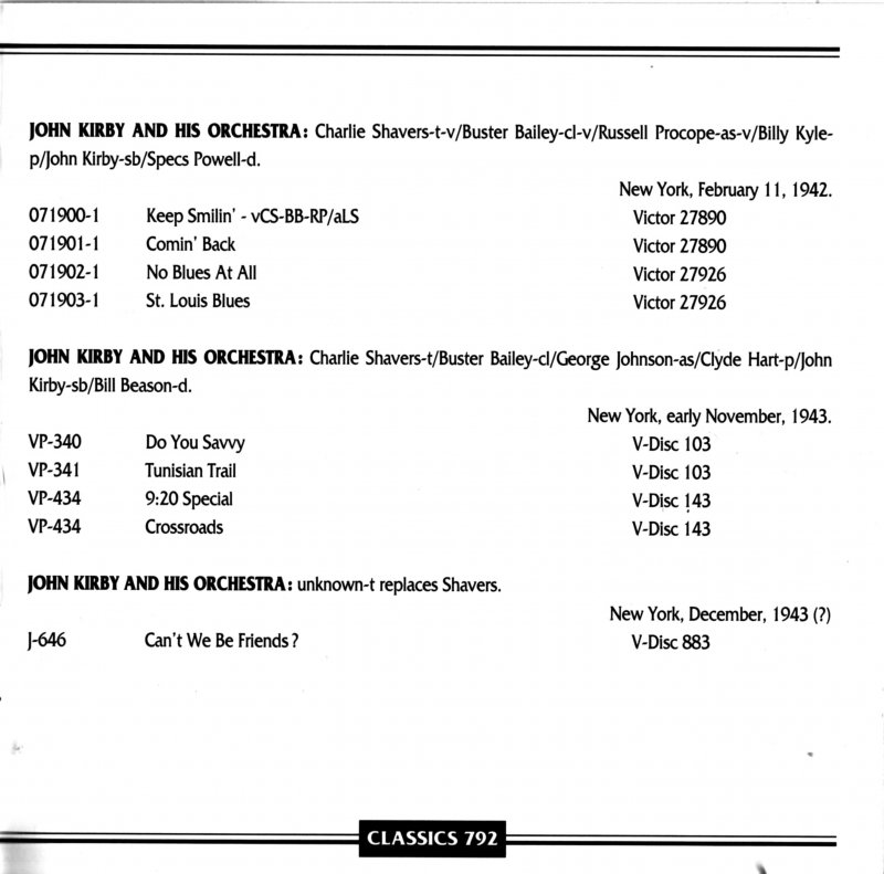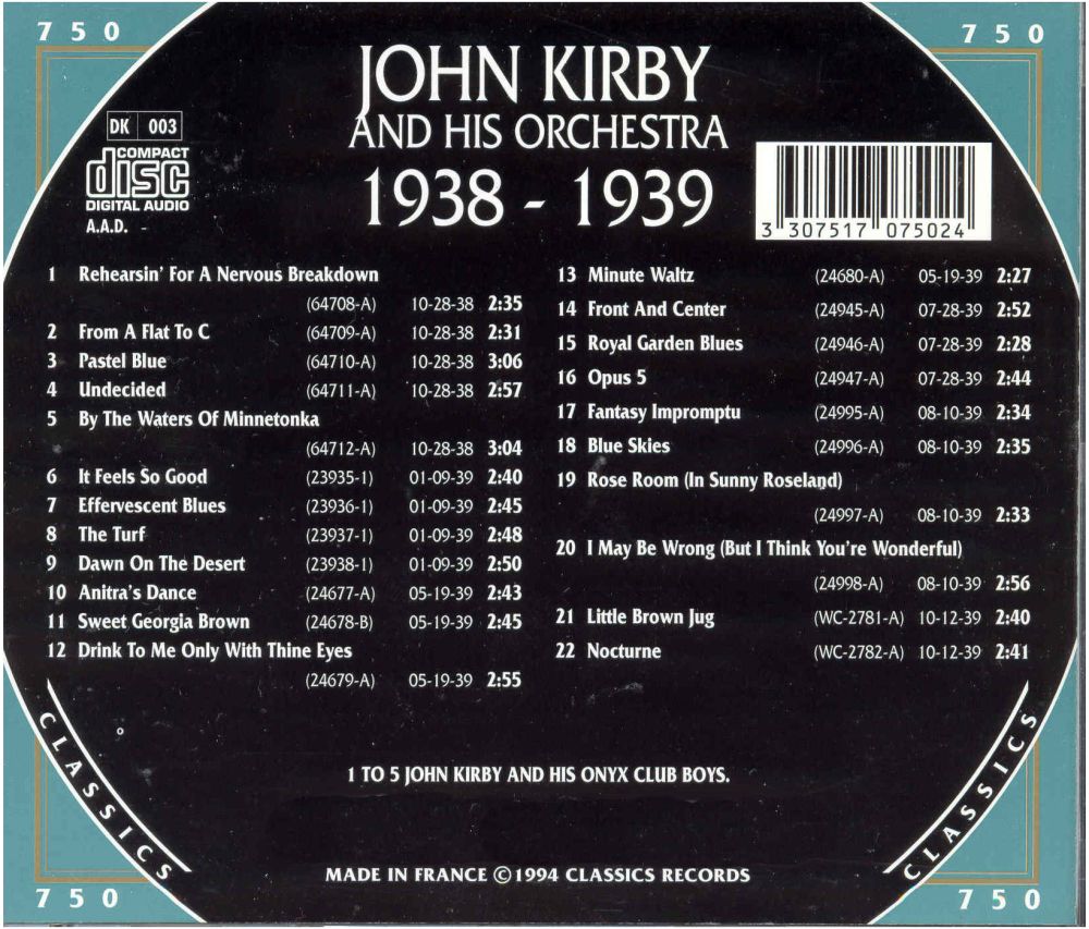 John Kirby bildete 1938 ein Ensemble, das in jeder Hinsicht Swingmusik im besten Sinn jener Zeit machte, aber gleichwohl eine Band in jenem Sinne war, wie er sich erst in den 50 er Jahren von selbst verstand. Sein präziser Ensemble-Stil nahm in Hinblick auf melodische Finesse und kammermusikalische Brillanz manches vorweg, was erst zwanzig Jahre später zum Inbegriff integrierten Jazz-Musizierens werden sollte. Mit John Kirby - und außerdem mit dem Nat King Cole-Trio – beginnt eine Linie, die über das Art Tatum-Trio und das Red Norvo-Trio zu all den charakteristischen Bands der 50 er und 60 er Jahre führt: dem Gerry Mulligan-Quartett, dem Modern Jazz Quartet, dem Jimmy Giuffre-Trio, dem Max Roach/Clifford Brown-Quintett, dem Miles Davis-Quintett, dem Horace Silver-Quintett, Art Blakeys Jazz Messengers, den Charles Mingus-Gruppen, den Ornette Coleman-Gruppen.