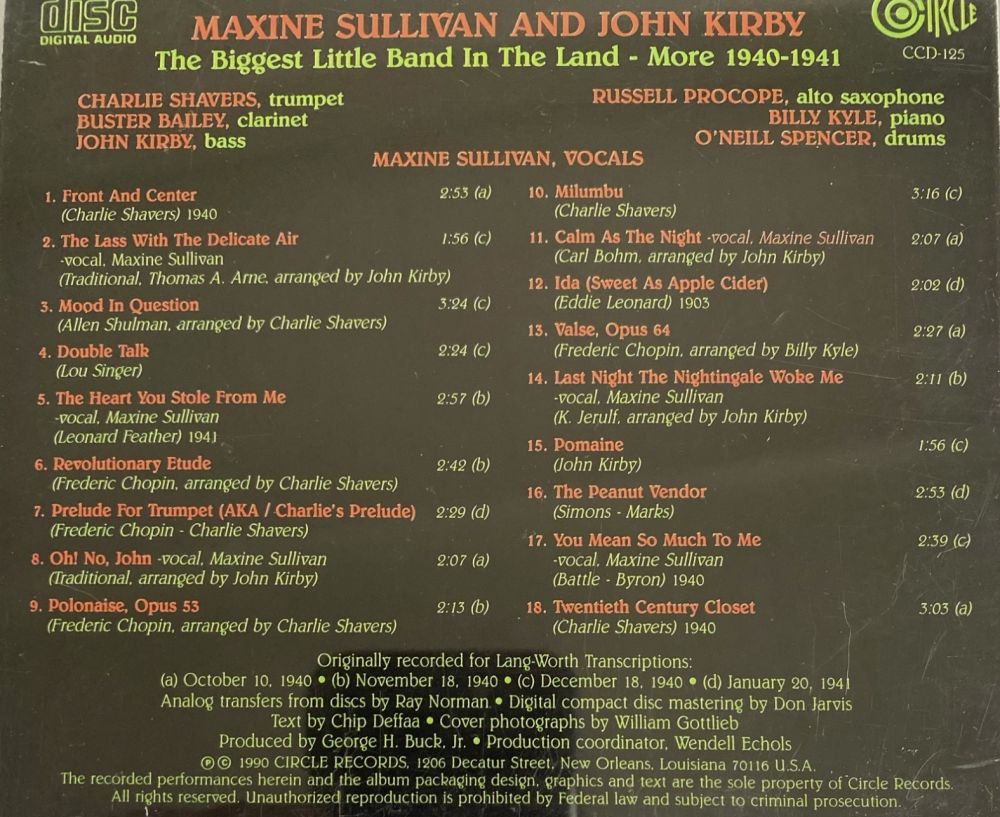 Der Bassist John Kirby gab in seiner Biggest Little Band in the Land leichte, verbindliche, kultivierte „Rahmenklänge“ vor, zwischen denen der Trompeter Charlie Shavers, der Klarinettist Buster Bailey, der Altsaxophonist Russell Procope und der Pianist Billy Kyle schöne, angenehm zu hörende Soli improvisierten. Die Band hatte einen klar erkennbaren Sound. Sie war das erste Ensemble, das als Combo in dem Sinn erfolgreich war wie fünfzehn Jahre später etwa das Gerry Mulligan-Quartett oder das Modern Jazz Quartet.