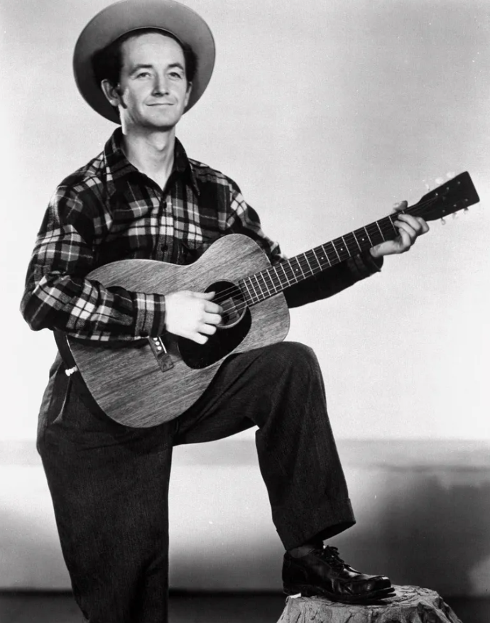 Woodie Guthrie ist Amerikas größter Balladendichter. Woody stammte aus schweren Zeiten und führte ein hartes Leben voller persönlicher Tragödien; und doch sind seine Lieder voller Hoffnung. Er bereiste das ganze Land und machte überall, wo er hinkam, Musik. Er hatte die Fähigkeit, sich mit den einfachen Leuten zu identifizieren und ihre Sprache zu sprechen, ohne die ausgefallenen Worte zu benutzen. Er war überhaupt nicht höflich, er fluchte und schockierte die Leute. Und er würde so bleiben, wie er war. Er ließ sich nicht von „Geldmännern“ zur Rache verleiten. Seine schroffe Ehrlichkeit kostete ihn viele Jobs. Pete Seeger sagt: „Na, so ist Woody eben. Er konnte seine Rechnungen nicht immer bezahlen und machte seiner Familie und seinen Freunden manchmal das Leben schwer – ständig auf Reisen, mit juckenden Fersen und Hummeln im Hintern – aber Herrgott, er hat ein Lied nach dem anderen geschrieben …“