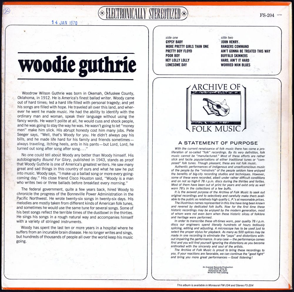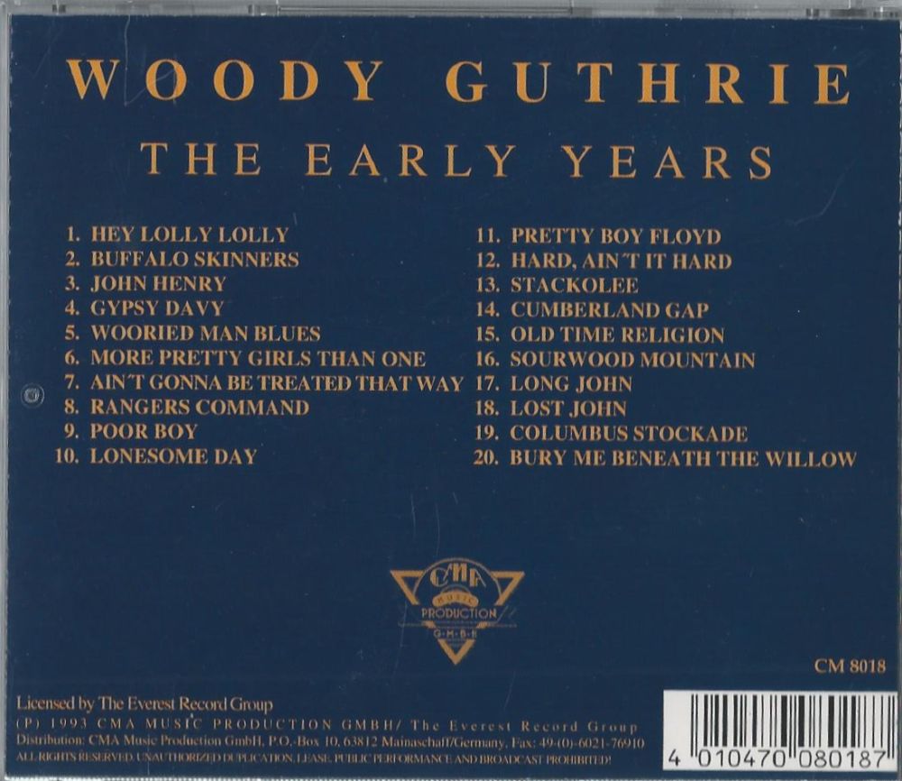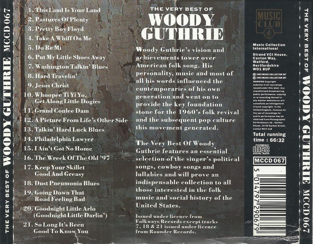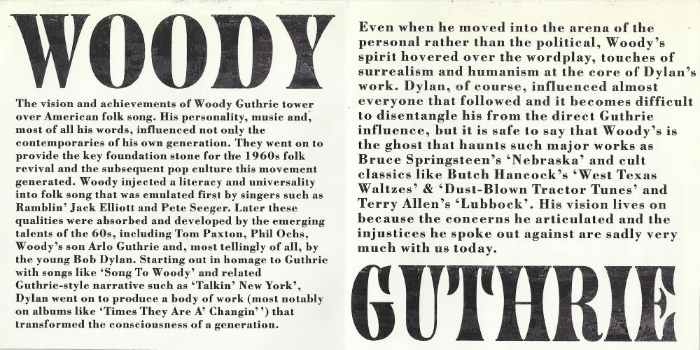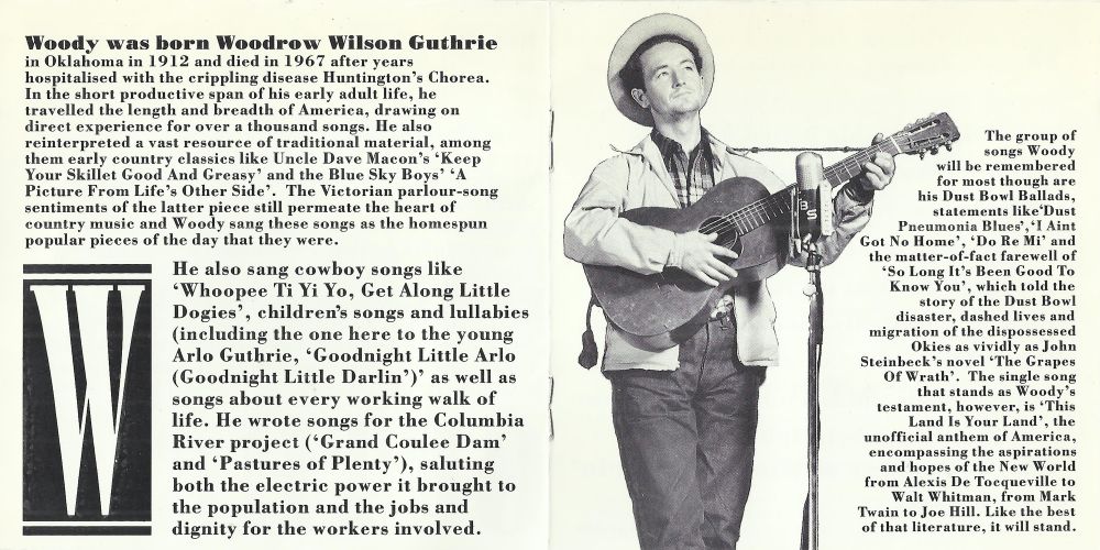 Woody wurde 1912 als Woodrow Wilson Guthrie in Oklahoma geboren und starb 1967 nach jahrelangem Krankenhausaufenthalt an der schweren Krankheit Chorea Huntington. In der kurzen produktiven Phase seines frühen Erwachsenenlebens bereiste er Amerika kreuz und quer und schöpfte aus seinen eigenen Erfahrungen für über tausend Lieder. Er interpretierte zudem eine große Bandbreite traditioneller Lieder neu, darunter frühe Country-Klassiker wie “Keep Your Skillet Good And Greasy“ von Uncle Dave Macon und “4A Picture From Life's Other Side“ von den Blue Sky Boys. Die viktorianische Stimmung des letztgenannten Stücks prägt bis heute das Herz der Country-Musik, und Woody sang diese Lieder als die bodenständigen, populären Stücke ihrer Zeit.