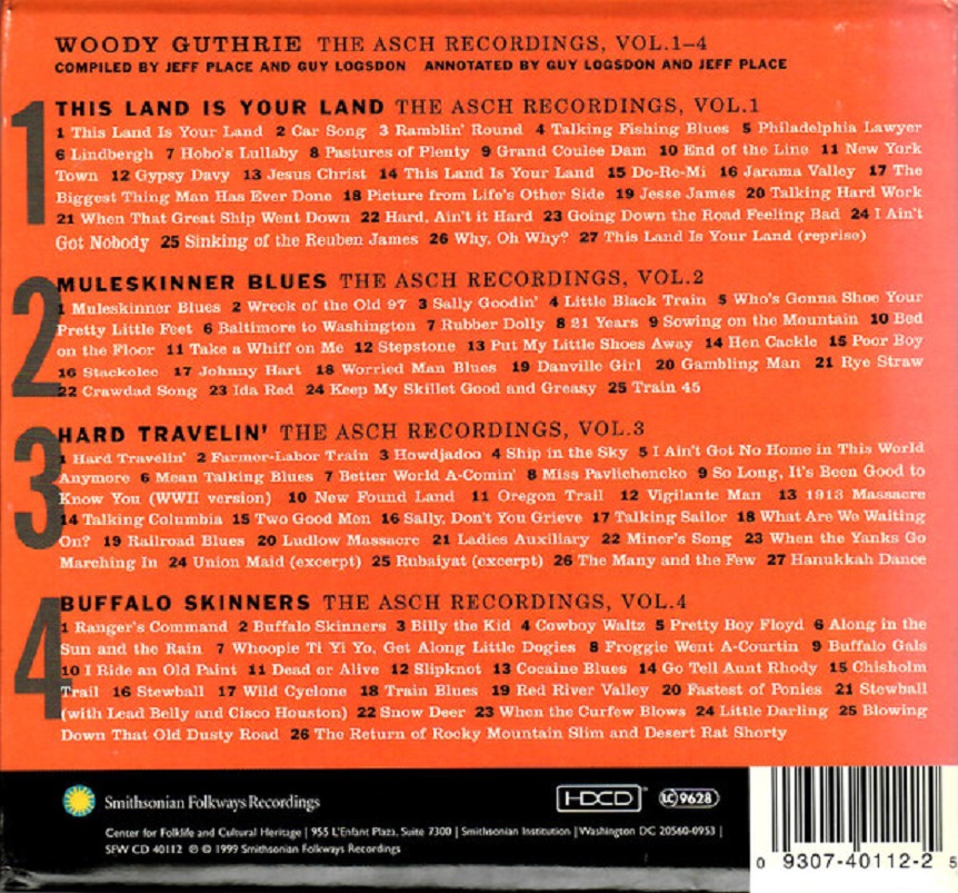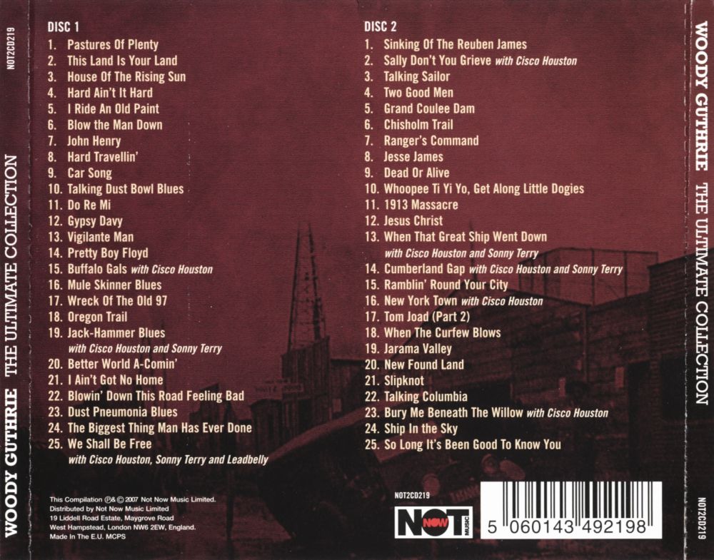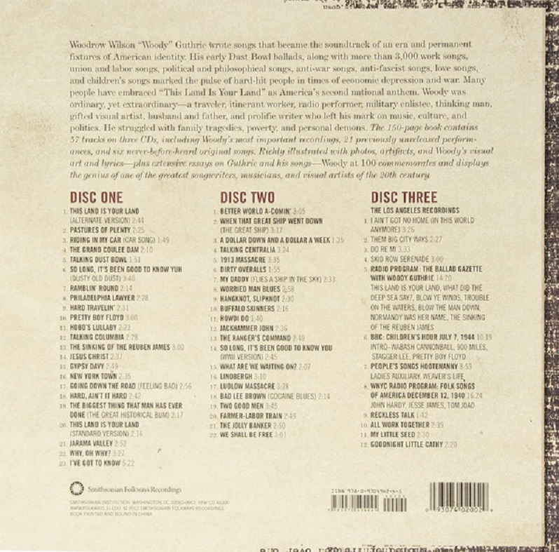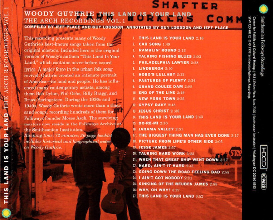 Woody wurde 1912 als Woodrow Wilson Guthrie in Oklahoma geboren und starb 1967 nach jahrelangem Krankenhausaufenthalt an der schweren Krankheit Chorea Huntington. In der kurzen produktiven Phase seines frühen Erwachsenenlebens bereiste er Amerika kreuz und quer und schöpfte aus seinen eigenen Erfahrungen für über tausend Lieder. Er interpretierte zudem eine große Bandbreite traditioneller Lieder neu, darunter frühe Country-Klassiker wie “Keep Your Skillet Good And Greasy“ von Uncle Dave Macon und “4A Picture From Life's Other Side“ von den Blue Sky Boys. Die viktorianische Stimmung des letztgenannten Stücks prägt bis heute das Herz der Country-Musik, und Woody sang diese Lieder als die bodenständigen, populären Stücke ihrer Zeit.