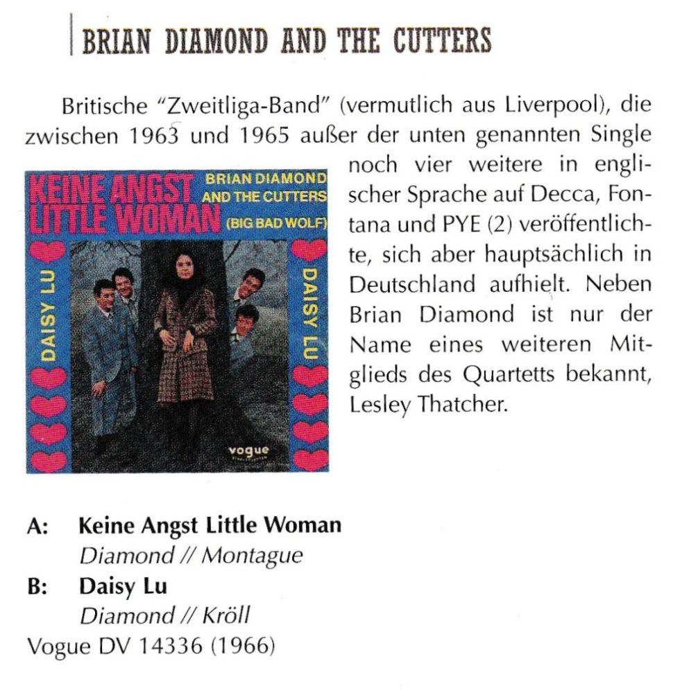Diese Abteilung reicht für den erstmaligen Einstieg bis 1963. Mit ihrer ersten Single vom September 1963 haben sich Brian Diamond and The Cutters den Einstieg in diese Abteilung noch gesichert. Keep Searchin’ Gerd Die Einstiegssingle aus dem Netz: Anhänge an diesem Beitrag Dateiname: Brian Diamond 1.jpg Dateigröße: 64.45 KB Titel: Heruntergeladen: 133 Dateiname: Brian Diamond 2.jpg Dateigröße: 71.15 KB Titel: Heruntergeladen: 257