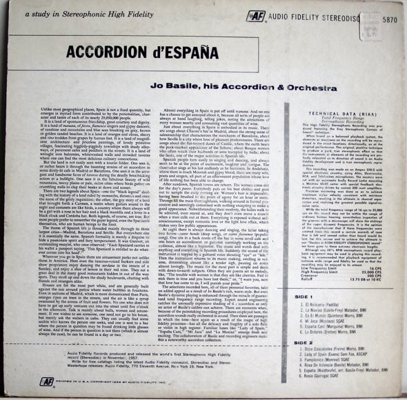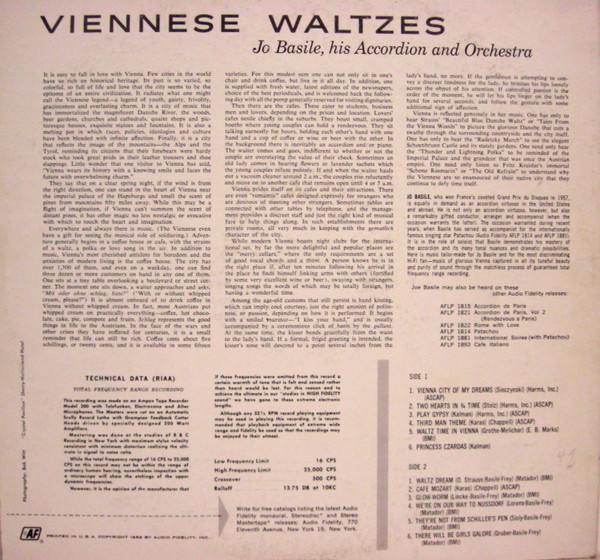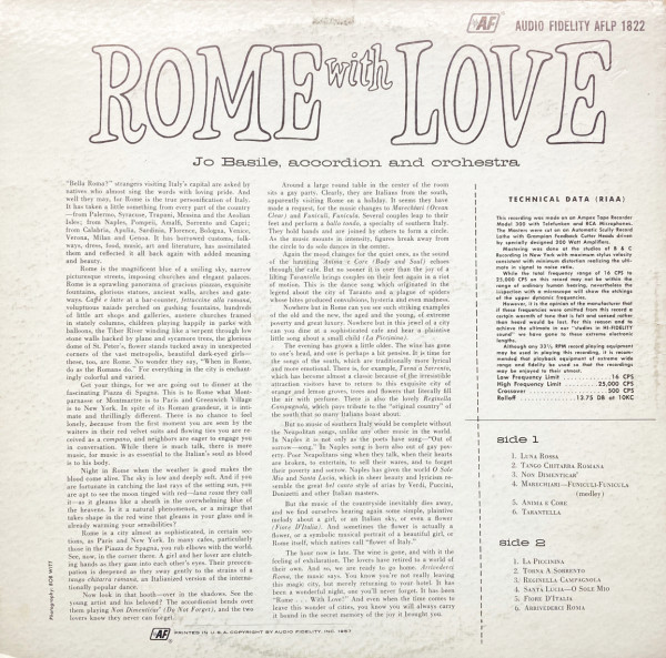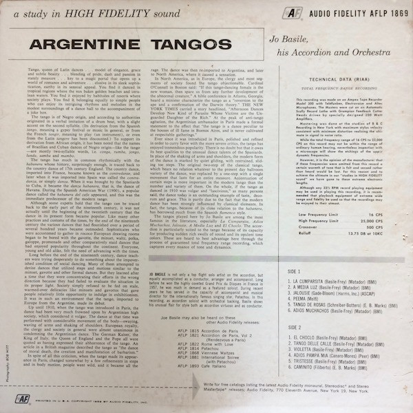 Während Patachous gefeierter Amerika-Tournee 1958 (auf der sie als Edith Piafs Chanson-Nachfolgerin gefeiert wurde) wurde Basellis Spiel von Sid Frey, dem Inhaber des Labels Audio Fidelity, bemerkt und fasziniert. Er benannte ihn in Jo Basile um und nutzte Patachous Popularität zunächst, um Basiles französische Café-Lieder und Instrumentalversionen einiger ihrer Hits aufzunehmen. Es war die erste einer langen Reihe von LPs (mindestens ein Dutzend Alben), die sich alle bemerkenswert ähnlich sahen und perfekt zu vielen Space-Age-Pop-/Exotica-Platten der damaligen Zeit passten.