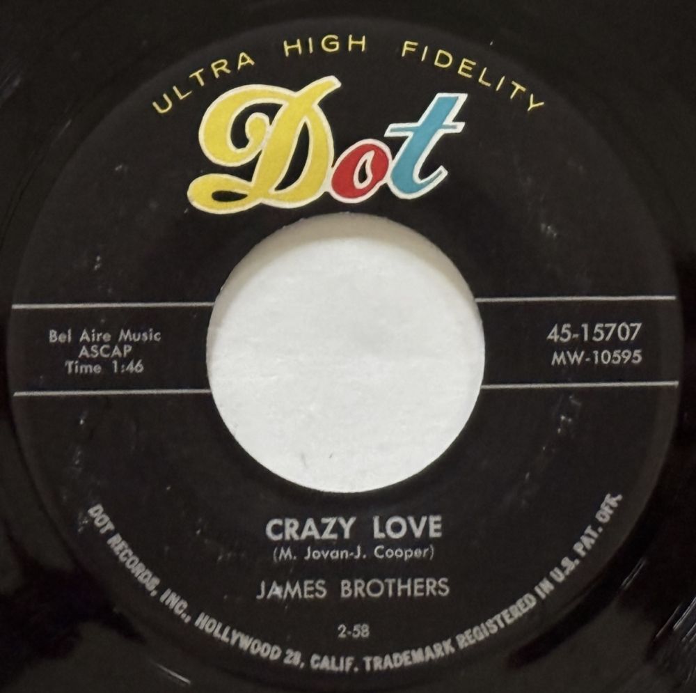 Laut Discogs waren diese James Brothers J. James und B. James aus Illinois, voller Vorname zur Zeit leider unbekannt, und es gab von ihnen noch eine zweite Single. Die zweite Single ist hinsichtlich Interpreten eindeutig, da B.E.A.T. in Chicago, Illinois, angesiedelt ist und die Interpreten auf dem Label auch als Autoren aufscheinen. DOT residierte zur Zeit ihrer ersten Single bereits in Kalifornien und die Interpreten waren keine Autoren. Das wäre zwar aufgrund der amerikanischen Verhätnisse kein wirklicher Ausschließungsgrund. Trotzdem bin ich mir nicht ganz sicher, ob die Brothers auf DOT tatsächlich mit jenen auf B.E.A.T. ident sind, wie Discogs meint.