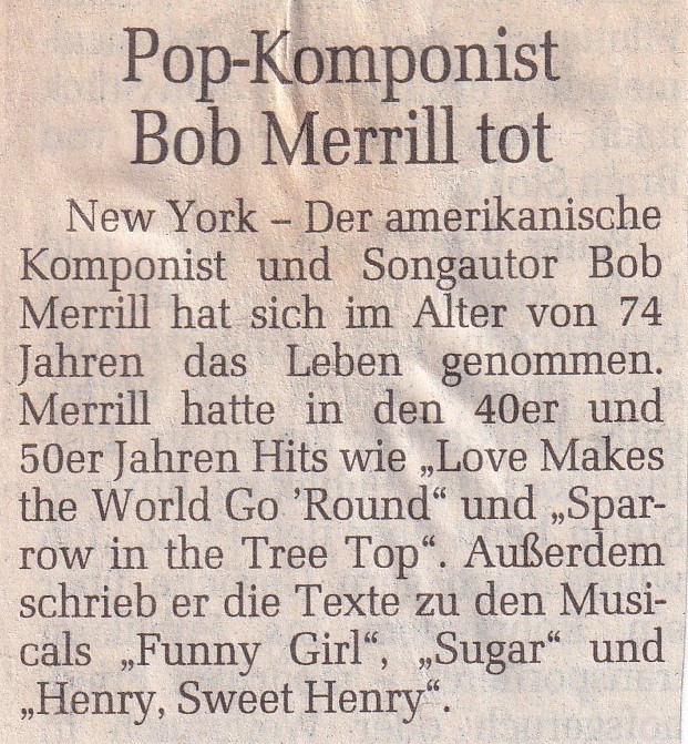 Bob Merrill, einer der produktivsten Musiker der Tin Pan Alley, der Musik oder Liedtexte oder beides für mehrere beliebte Broadway-Musicals, darunter "Funny Girl", schrieb und die Nation dazu brachte, mit solchen Neuheiten wie "How Much is that Doggie in the Window?" die Füße zu wippen, wurde am Dienstag tot in seinem Auto in Culver City/Kalifornien aufgefunden. Er war 74 Jahre alt und lebte in Beverly Hills/Kalifornien.