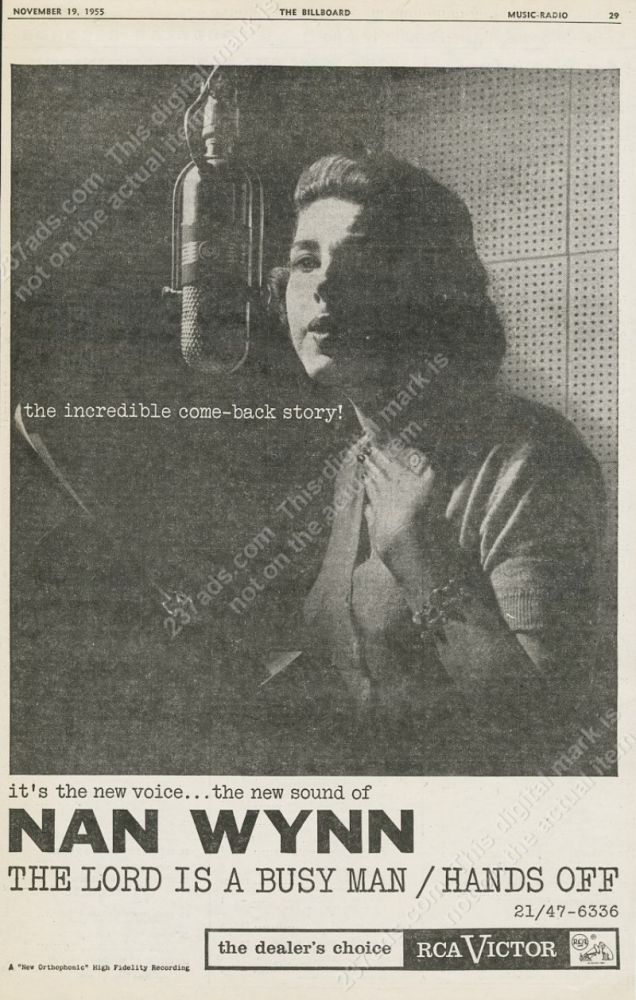 Nan Wynn war eine US-amerikanische Bigband-Sängerin, Broadway- und Filmschauspielerin. Sie sang und nahm in den 1930 er und 1940 er Jahren mit den Orchestern Emery Deutsch, Rudy Vallee, Eddie Duchin, Richard Himber, Hal Kemp, Hudson-DeLange, Raymond Scott, Teddy Wilson und Freddie Rich auf. Zu Beginn ihrer Karriere trat sie etwa neun Monate lang als Suzanne auf.