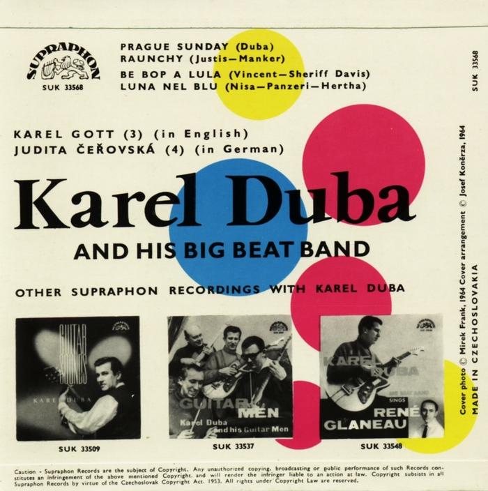 hier ein zweiter (und letzter) Würdigungsversuch. 1964 erschien in der damaligen Tschechoslowakei die EP "Prague Sunday" von Karel Duba & His Big Beat Band (SUPPRAPHON 33568). Soweit kein Aufreger. Track 3 hingegen schon: Karel Gott nimmt es mit Gene Vincent auf - Be Bop A Lula - in the english language.