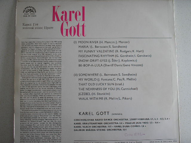 Karel singt hier die nicht ganz schlechte bereits erwähnte Gene Vincent Coverversion von Be bop a lula, andere schöne eher jazzige Titel: Moon River, Maria, My funny Valentine, Fascinating rhythm, Snowdrift eyes, Be bop a lula, Somewhere, My World, That lucky old sun, The nearness of you, Jezebel und Walk with me. 1966 als LP erschienen. 😉