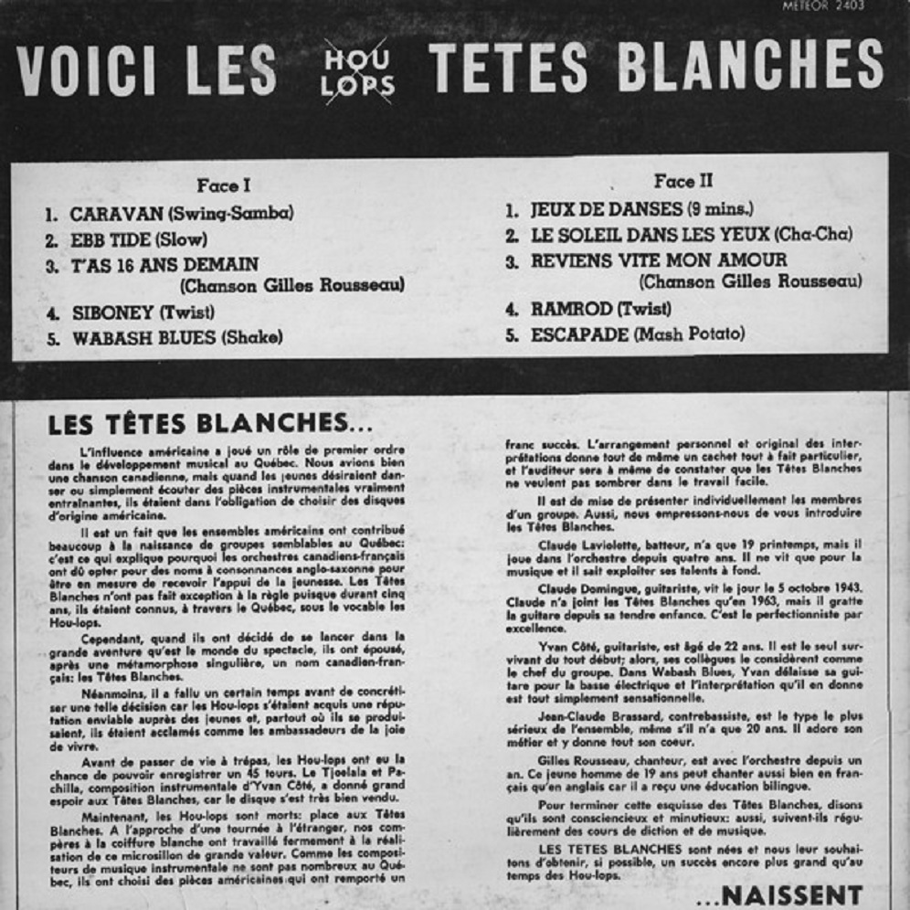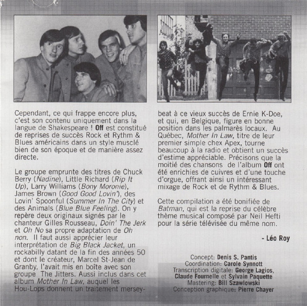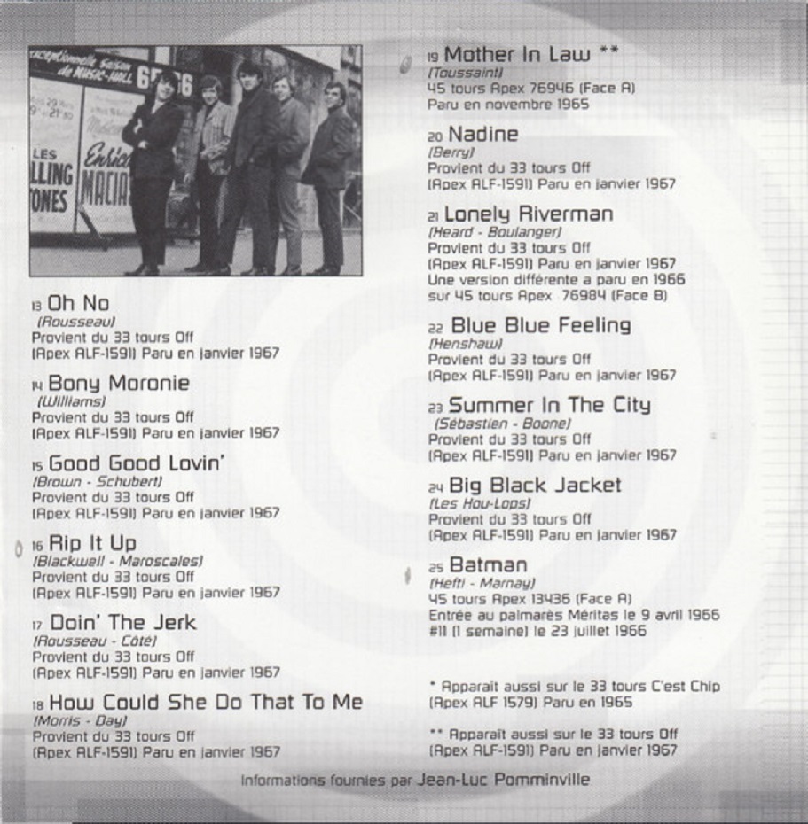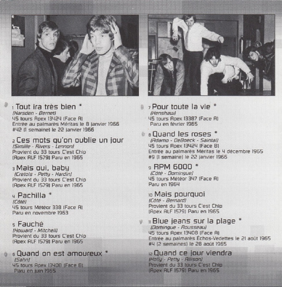 Serge Sauvé (vocals), Gilles Rousseau (vocals, 1963-1969), Yvan CÎté (lead guitar), Jean-Claude Domingue (guitar) replaced by René Hamelin (1968-1969), Jacques Chicoine (keyboard), Jean-Claude Bernard (bass), Isabelle Allard (drum), Claude Laviolette (drum, 1961-1969), Gérald Locas (piano, 1961).