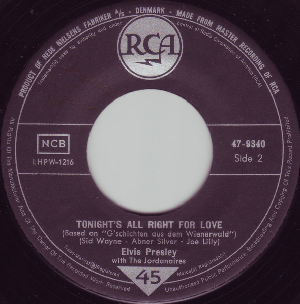 Wie in unserem Sprachraum üblich, wollte TELDEC noch „besser“ sein als Colonel Parker, der in den USA keine Single mit “Wooden Heart“ machte, TELDEC bestand aber darauf und das war nicht unsere Sache, aber die andere Seite “Tonight’s All Right For Love“ war zwar auch nicht mehr typisch Elvis, aber für uns Elvis-Fans doch noch tragbar. Sid Wayne, Abner Silver und Joe Lilly haben aus “G’schichten aus dem Wienerwald“ von Johann Strauss Sohn einen annehmbaren Pop-Titel gemacht, weshalb war daher zwangsweise auch “Wooden Heart“ in unser Schallplatten-Konvolut einbezogen wurde.