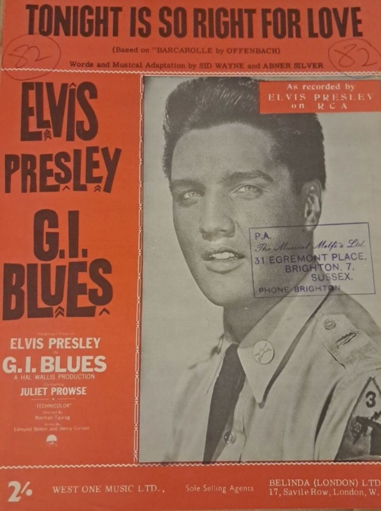 Nach dieser langen und sehr subjektiven Einleitung, kommt es jetzt endlich zur Erklärung, warum ich diesem Titel ein Songtitel-Forum widmen werde. Bei den “G’schichten aus dem Wienerwald“ handelt es sich nämlich nicht um das Original, welches man in den USA auf Platte und im Film “G. I. Blues“ hören konnte, denn Sid Wayne und Abner Silver nahmen als Basis für den Titel “Tonight Is So Right For Love“ die “Barcarolle“ von Jacques Offenbach. Colonel Parker hat es aber verabsäumt, sich die Rechte dieses Titels von Offenbach für den deutschsprachigen Raum zu sichern und so musste man für die “Wooden Heart“-Single im Dezember 1960 zu dieser Notlösung greifen. Im Film „Cafe Europa“ (“G. I. Blues") musste diese Sequenz ebenfalls nachgedreht werden und auch auf der LP “ELVIS - G. I. BLUES“ (LPM-2256) gab es bei uns nur die Johann Strauss-Version zu hören. Interessanterweise gefällt mir die Johann Strauss-Version subjektiv weit besser als die Offenbach-Version. Das kann aber auch daran liegen, dass wir die Barcarolle von Elvis nie hören konnten und daher überhaupt nicht im Ohr hatten. Die Briten griffen die Single-Idee von TELDEC auf und brachten im März 1961 die gleiche Single auf den Markt und da die Urheberrechte der Familie Offenbach offenbar nicht bis Großbritannien reichten, gab es auf der britischen Single die Offenbach-Version.