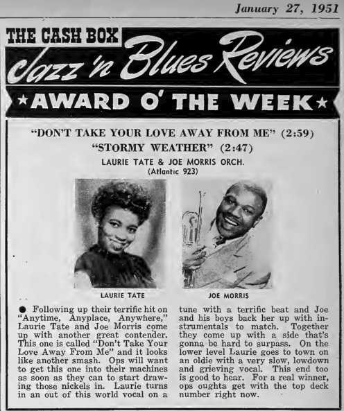 Es ist zu vermuten, dass Herb Abramson, Mitbegründer des Atlantic-Label, bei der Suche nach Talenten in Richmond/Virginia auf die "schwarze" Sängerin Laurie Tate stieß und sie umgehend verpflichtete. Ihr erster Versuch als Joe Morris And His Orchestra featuring Laurie Tate wurde gleich ein durchschlagender Erfolg. Die Verkaufszahlen mit diesem Titel waren so gut, dass es Atlantic wagte, die Schallplatte als erste Veröffentlichung des Labels parallel als 78er auch als 45er, im neumodischen 7“-Format, herauszubringen.