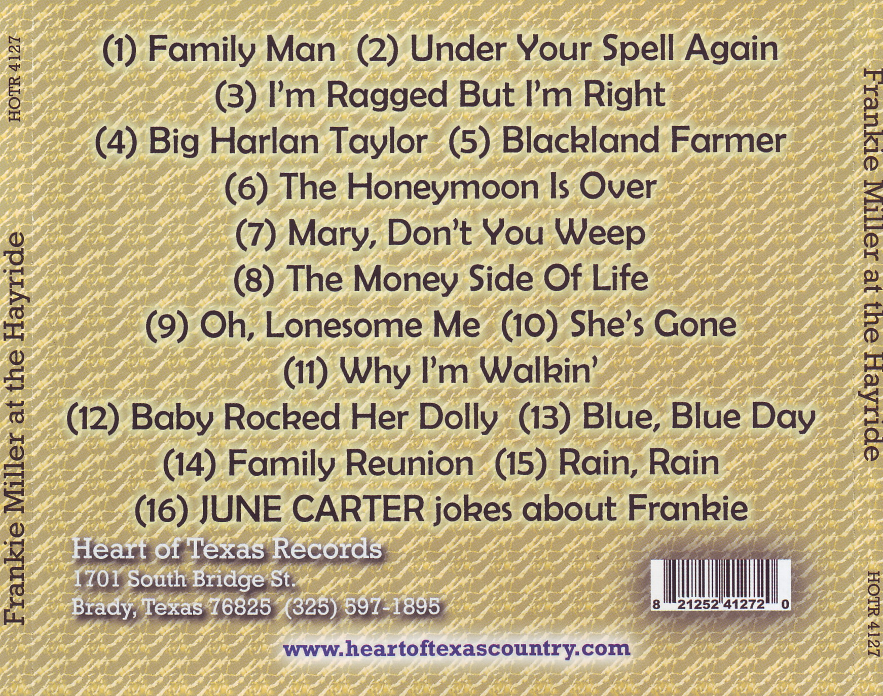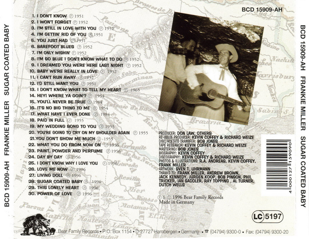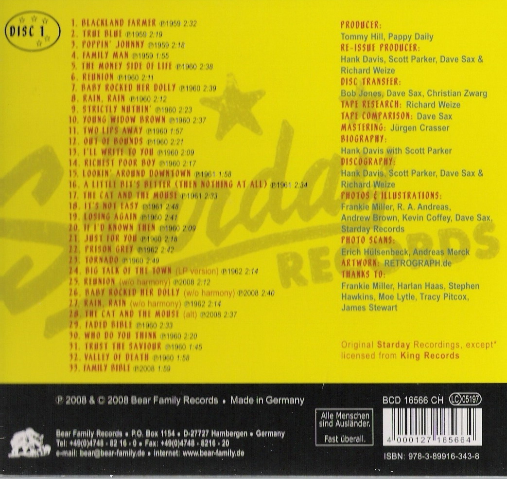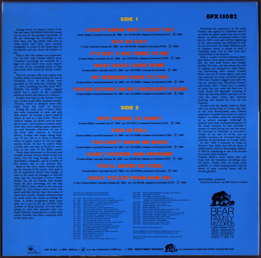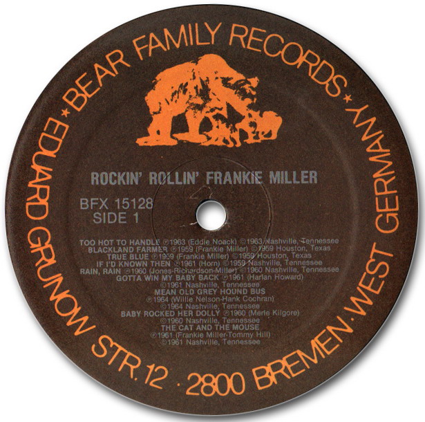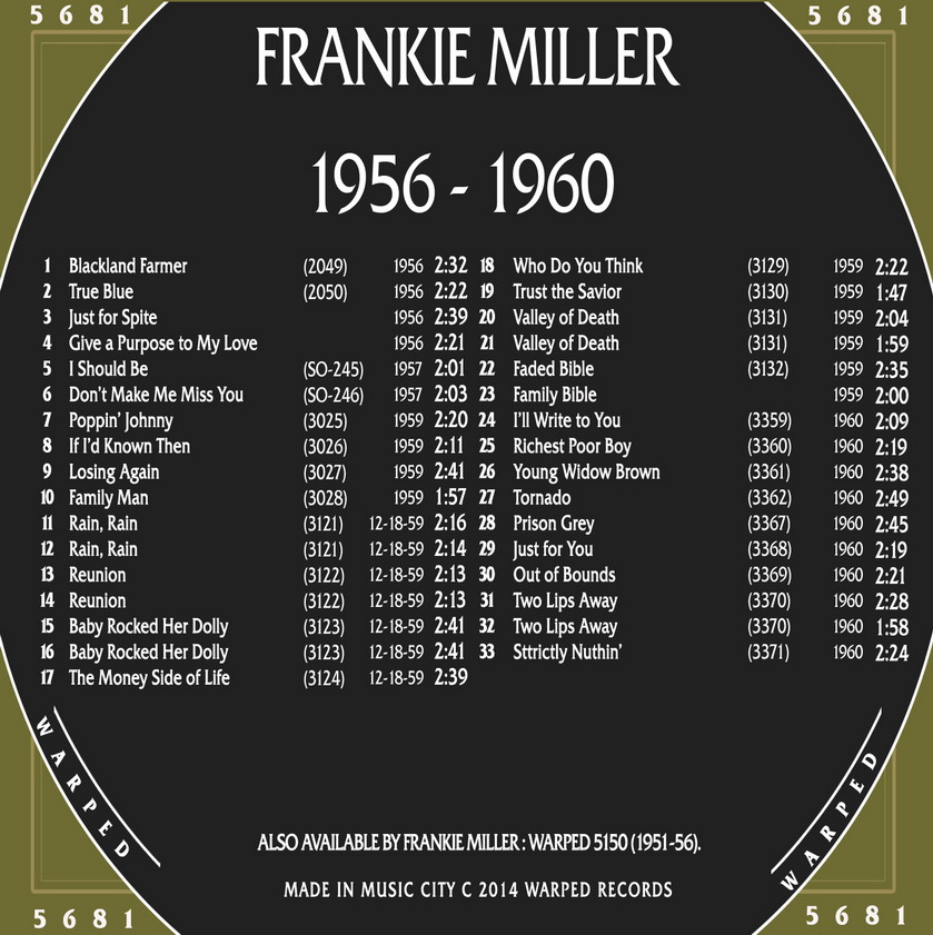 Frankie Miller, geb. 17. Dezember 1930 (oder 1931 ?) in Victoria, Texas, ist sicherlich bei der Einordnung in Rockabilly als Grenzfall zu bezeichnen. Aber schon wegen "Black Land Farmer" möchte ich ihn hier einordnen. Es folgt eine Single-Disco und nachher die Scans meiner vier STARDAY-Singles:
