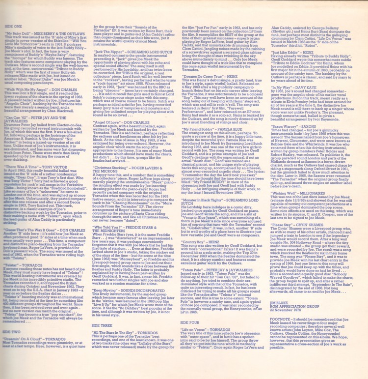 mit dieser Doppel LP fing die Begeisterung für Joe Meek Produktionen bei mir an. Klar, man kannte "Telstar" und "Tribute To Buddy Holly" - das war es schon. Die Auswahl der Songs zeigen die volle Bandbreite der Produktionen. Danke an Jim Blake und Alan Blackburn - R.G.M. Appreciation Group.