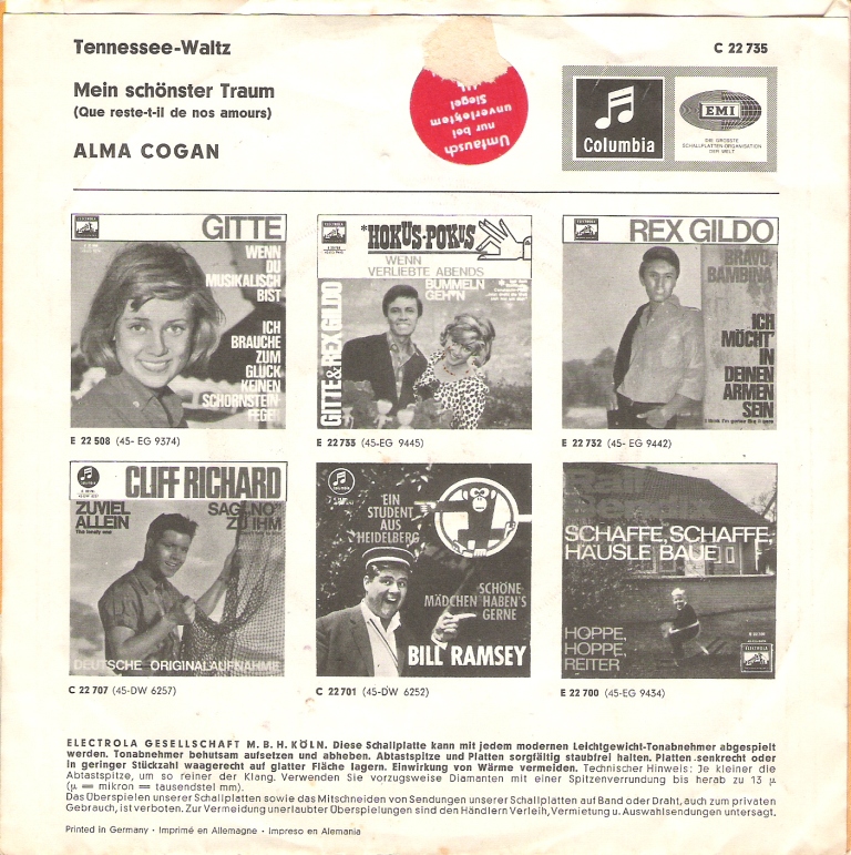 Für den deutschen Markt nahm Patti Page 1966 auf CBS 2433 die Titel “Beinah’ Verloren (Almost Persuaded)“/“Wenn Diese Welt Nicht So Schön Wär’“ auf.