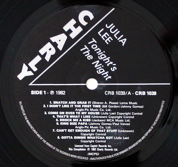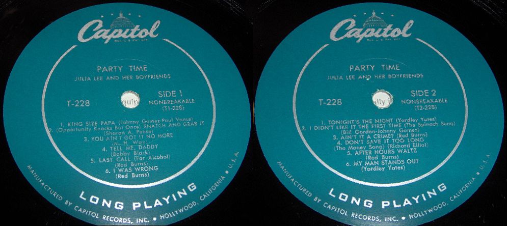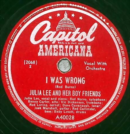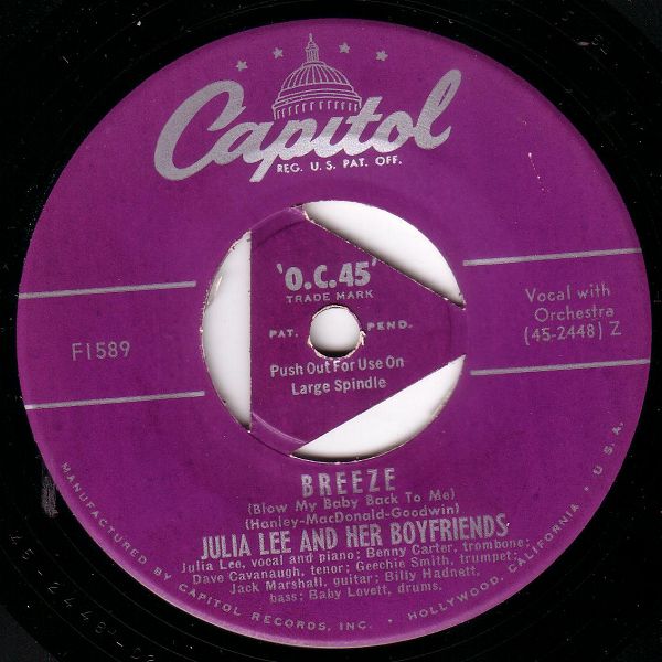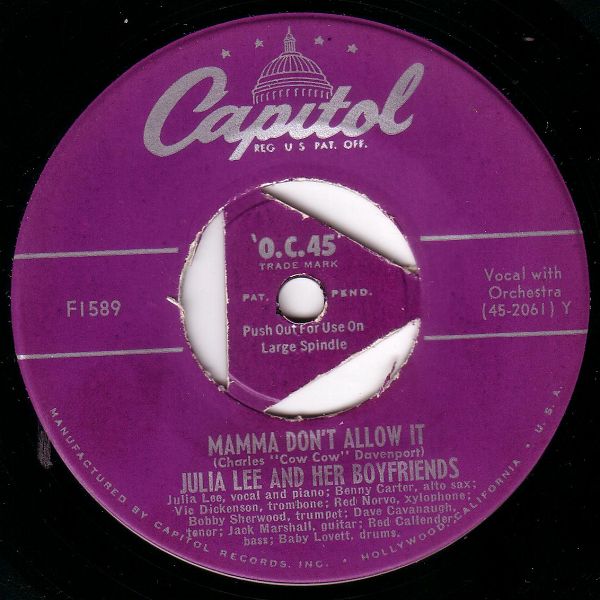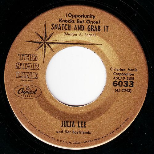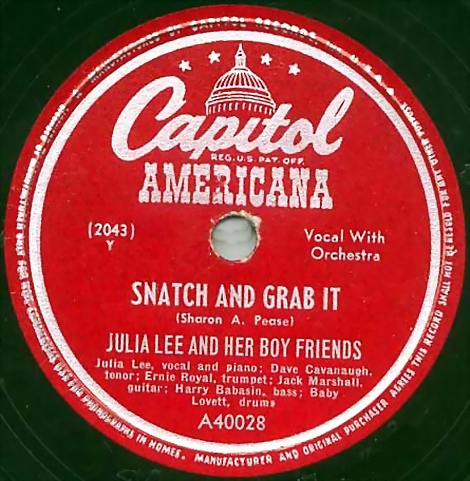 04 49...F15589 (CCF-228)...JULIA LEE AND HER BOY FRIENDS Julia Lee, vocal and piano; Dave Cavanaugh, tenor; Ernie Royal, trumpet; Jack Marshall, guitar; Harry Babasin, bass; Baby Lovett, drums (Opportunity Knocks But Once) Snatch And Grab It (45-2043) Y/Julia Lee, vocal & piano; Baby Lovett, drums; Vic Dickerson, trombone; Bobby Sherwood, cornet; Red Norvo, xylophone; Dave Cavanaugh, tenor; Benny Carter, alto; Jack Marshall, guitar; Red Callender, bass Ain't It A Crime? (45 2063) Z