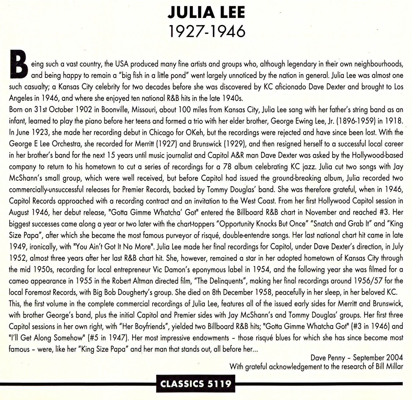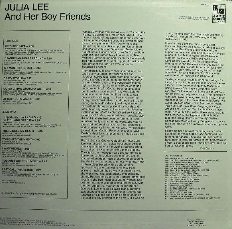 Julia Lee, geb. 31. Oktober 1902 in Booneville, Missouri, gest. 8. Dezember 1958, erst 56-jährig an einer Herz-Attacke. Etwa um 1920 begann ihre Karriere als Sängerin und Pianistin in der Band ihres Bruders George Lee, in der einige Zeit auch Charlie Parker dabei war. Ihre ersten Plattenaufnahmen machte sie 1927 mit Jesse Stone bei dem MERRITT-Label. 1935 startete sie dann ihre Solo-Karriere. 1944 gewann sie einen Platten-Vertrag mit CAPITOL, wo auch ihre bekanntesten Aufnahmen erschienen.