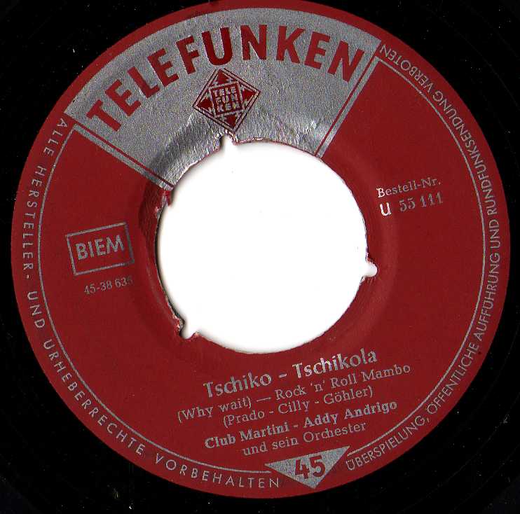 Das Original ist die B-Seite von Patricia (dieser Titel wurde bereits an anderer Stelle im Forum vorgestellt) und ist eine typische Perez Prado Nummer. Bei der deutschen Version konnte das Orchester Addy Andrigo nicht die musikalische Qualität des Originals erreichen. Unter Club Martini dürfte sich ein gemischter Studio-Chor verbergen, genaues ist mir nicht bekannt. Auch textlich typisch 50er Jahre, reißt die deutsche Fassung niemand mit. Kurios ist die Tanzangabe Rock `n´ Roll Mambo auf dem Label.