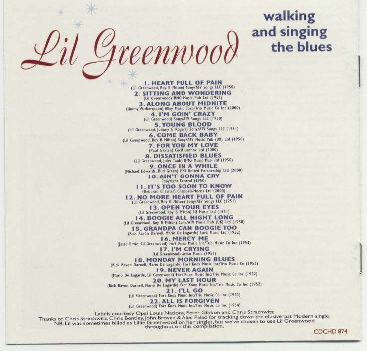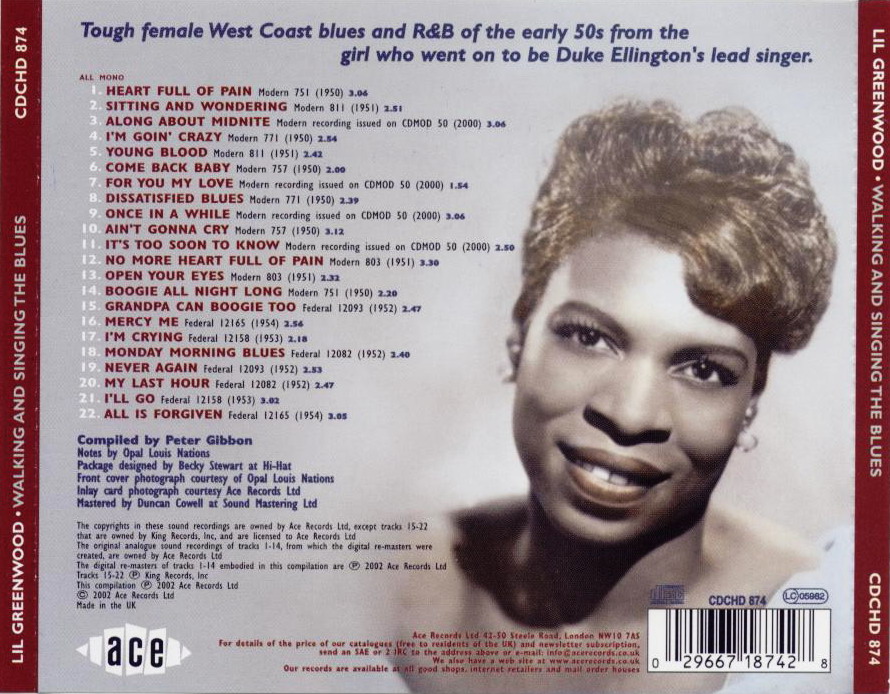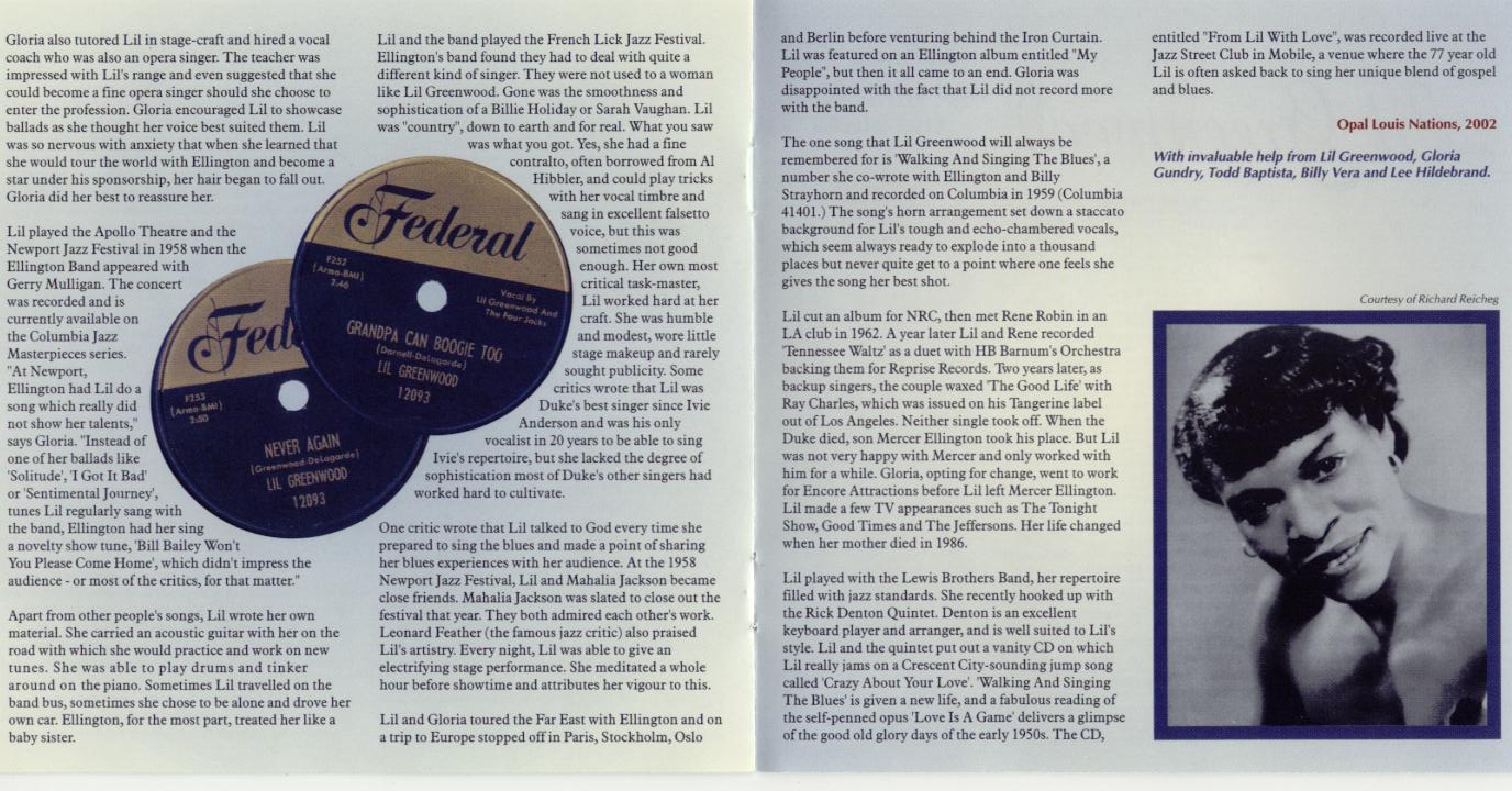 Kurz-Bio: Das Mitglied des Duke Ellington Orchesters von 1956 bis etwa 1962, die R&B- und Jazzsängerin Lil Greenwood wurde am 18. November 1924 in Prichard, Alabama, als Lillian Belle George geboren und verstarb am 19. Juli 2011 in Mobile, Alabama.