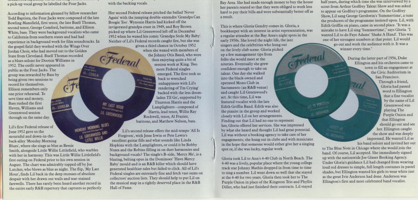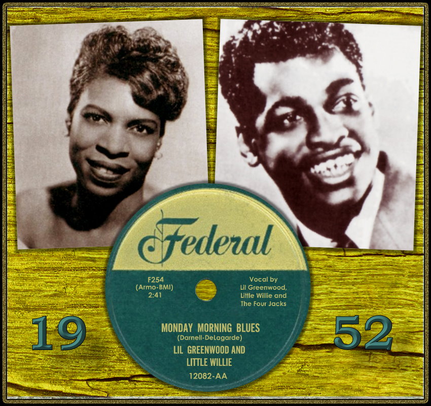 FEDERAL 06 52....45—12082....LIL GREENWOOD and LITTLE WILLIE Vocal by Lil Greenwood, Little Willie and The Four Jacks..Monday Morning Blues (45—F254)/LIL GREENWOOD Vocal by Lil Greenwood and The Four Jacks..My Last Hour (45—F255)