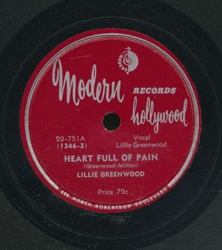 Die Singles: MODERN (78er) 04 50....20-751A....LILLIE GREENWOOD..Heart Full Of Pain (1346-3)/B….Boogie All Night Long (1344-5)