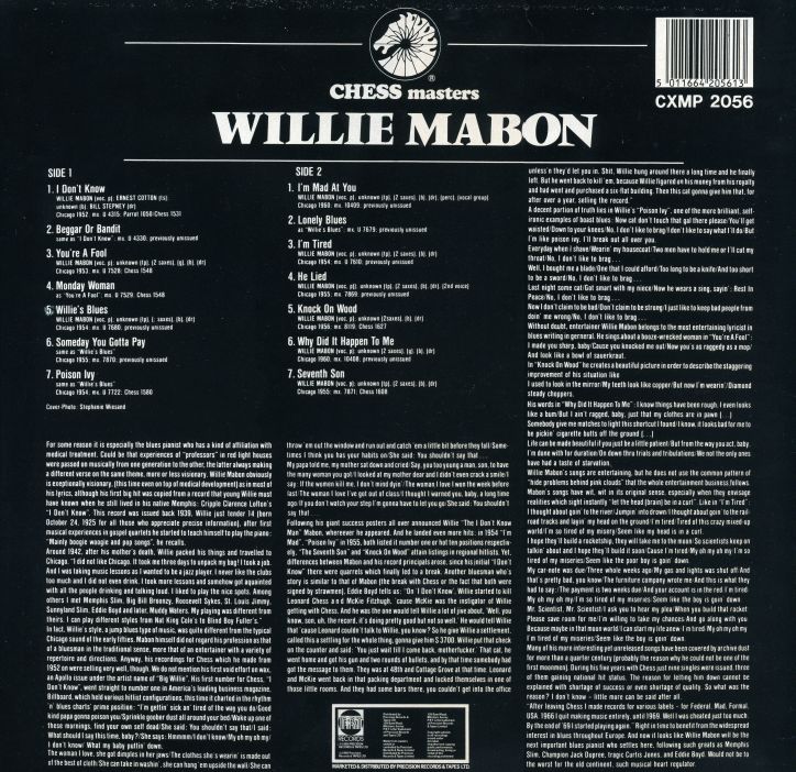 Aufgewachsen in Memphis, Tennessee, kam Mabon 1942 als bereits versierter Blueser nach Chicago. Er gründete die Band "The Blues Rockers" und machte ab 1949 Aufnahmen für verschiedene Plattenlabel. Nach seinem Riesenhit in 1952 "I Don't Know" folgten 1953 "I'm Mad" und 1954 "Poison Ivy". Mein absoluter Favorit von Willie Mabon ist "The Seventh Son" aus 1955. Der Song wurde von Willie Dixon geschrieben. Nach mehrmaligem Hören kriegt man Melodie und Rhytmus nicht mehr aus dem Ohr. Das ging vielen Musikern so, weshalb es Coverversionen von ganz unterschiedlichen Akteuren gibt. Zum Beispiel: Johnny Rivers, Bill Haley (El Septimo Hijo, 1966), Mosse Allison (mit wunderbaren Bebop Vocals, 1958), Peggy Lee, Sly & The Family Stone, The Astronauts, The Mindbenders, Georgie Fame (tolle Beatversion) und viele mehr ...