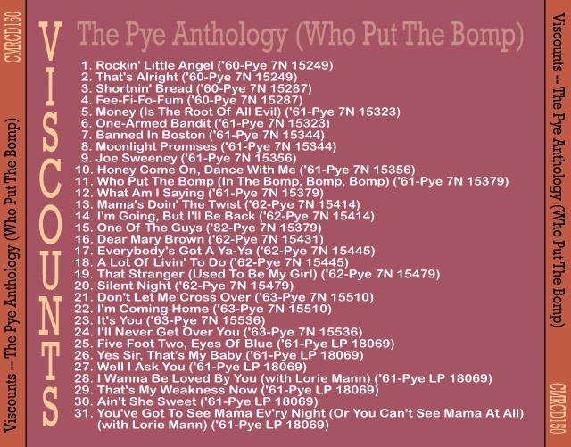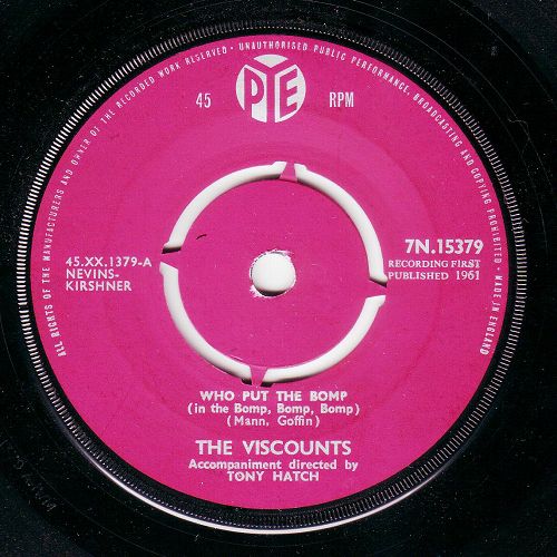 Don Paul, Ronnie Wells und Gordon Mills, bekannt als britische Vokal-Gruppe The Viscounts, fristen seit August 2008 noch immer ihr klägliches Dasein zwischen einen unrichtigen Themen-Titel und der tatsächlichen Instrumental-Gruppe The Viscounts aus den USA. Niemanden hat das bisher gestört, außer mir und so verschaffe ich ihnen ein eigenes Thema wo sie musikalisch hingehören. Da es für britische Rocknroller keinen Bereich gibt, mußte ich sie in die USA transferieren. Aber dafür können sie jetzt freien Mutes weiter dem Gesang fröhnen, da sie nicht mehr als "Instrumentalgruppe" mundtot gemacht werden können. Die amerikanische Instrumentalgruppe gleichen Namens fing ja auch nicht zu singen an.