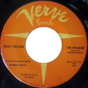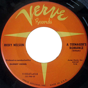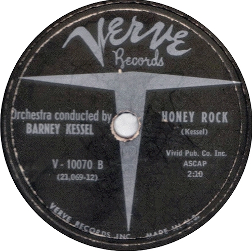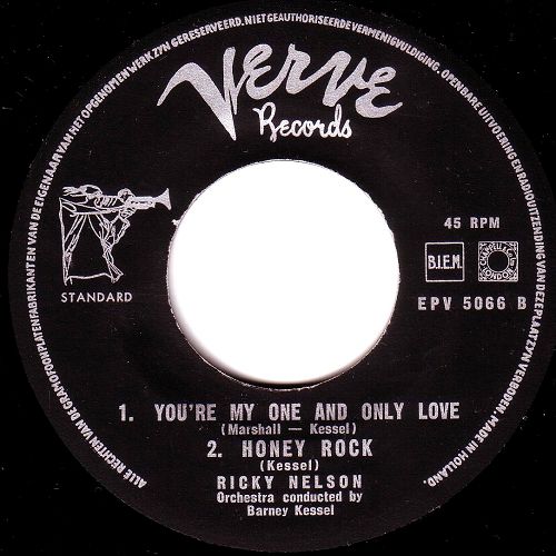 was hat Barney Kessel mit dem Rock'n Roll und speziell mit Ricky Nelson zu tun? Wer hat die ersten drei Aufnahmen von Ricky Nelson produziert? Dreht man die zweite Nelson-Single aus 1957 um (VERVE 10070 *), taucht Barney Kessel mit seinem fast-Instrumental "Honey Rock" auf. Das immer wieder und von einer Frauenstimme hineingerufene "Honey" ist schon der ganze Text. Kessel soll den Song innerhalb von zehn Sekunden geschrieben haben. Unbedingt anhören! Außer besagter Verve-Single findet sich der Titel auf einer handvoll Ricky Nelson EP's und auch auf einer Donauland LP aus Österreich wieder, siehe im Forum hier: