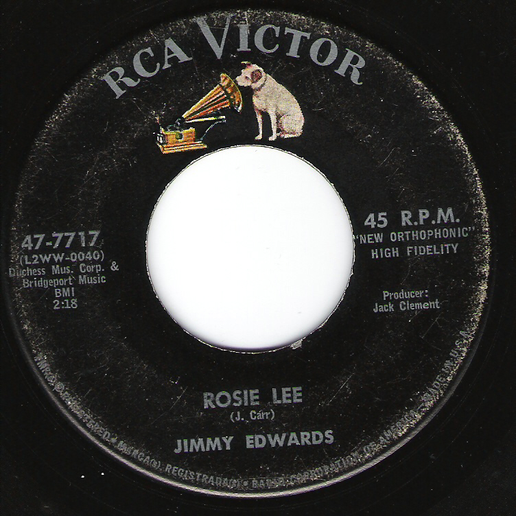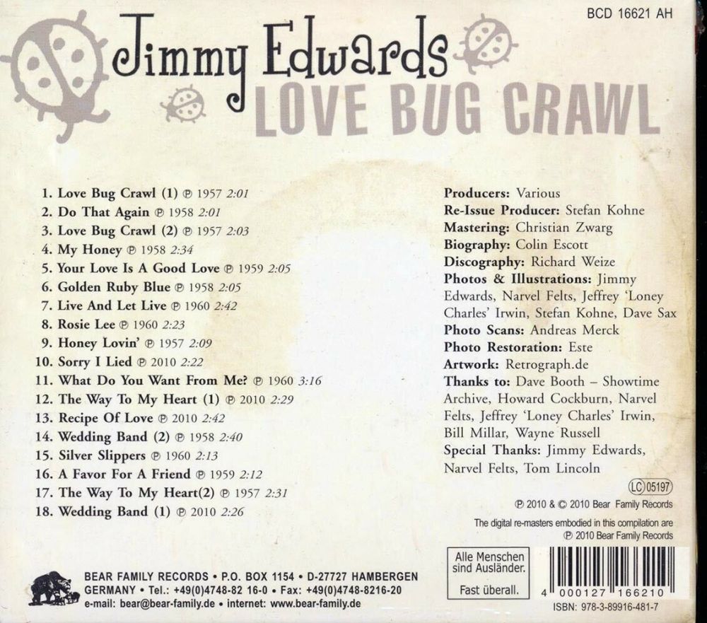 Jimmy Edwards (geb. 1929 in Senath, Missouri) hatte 1957 einen Fast-Hit mit "Love Bug Crawl" (Mercury 71209X45), einer schnellen, poppigen Rockabilly-Nummer im Elvis-Stil mit fantastischer Leadgitarrenarbeit, die er unter seinem richtigen Namen Jim Bullington ein paar Monate früher bereits für das kleine Wendesday-Label aufgenommen hatte. Nach dem, was ich bei Rockin' Country Style hören konnte, ist die Mercury-Version um einiges munterer und rockiger (wie gesagt, die Leadgitarre...). Die B-Seite "Honey Lovin'", eine Calypso-artige Pop-Nummer, fällt dagegen ziemlich ab.