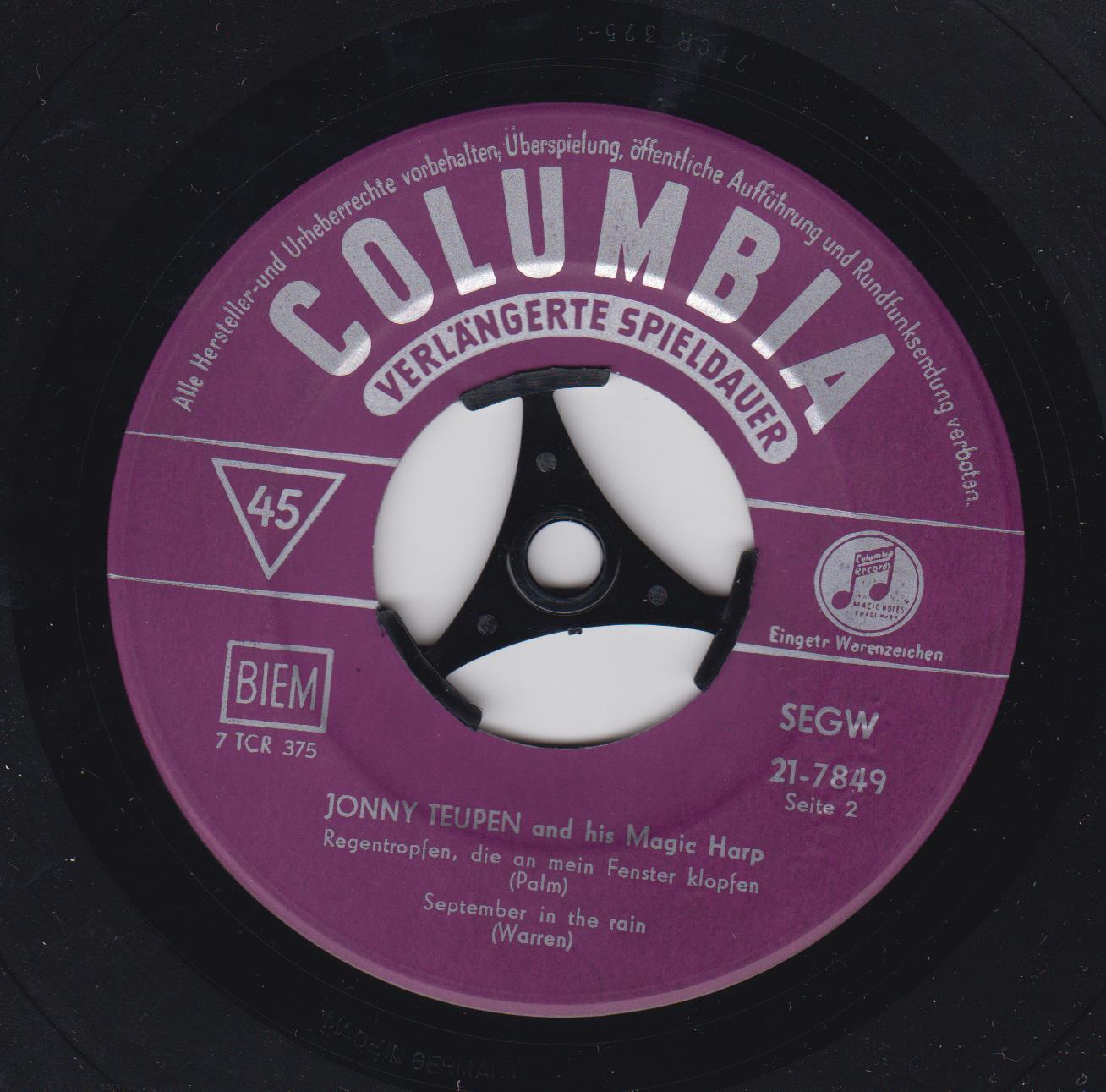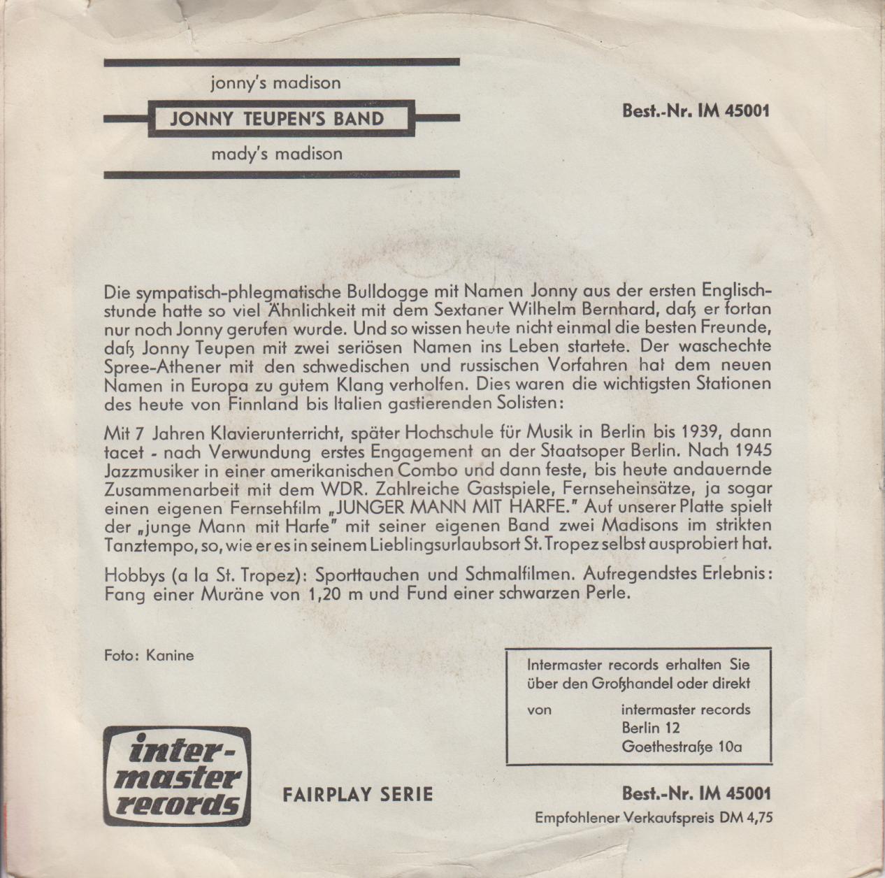 Einmal ganz was anderes. Die A-Seite dieser Single (die B-Seite liegt mir nicht so sehr) habe ich im Jahre 1960 in der Musicbox eines Espressos in Meidling (das ist ein Wiener Bezirk) gehört und die Melodie ließ mich nicht mehr los. Es heißt zwar "Gay 90's Rock" ist aber nichts Flottes sondern wenn man will ein Slow-Rock. Es basiert auf einen alten Salonstück der polnischen Komponistin Tekla Badarczewska-Baranowska aus dem 19. Jahrhundert und heißt im Original "Gebet einer Jungfrau". Jonny Teupen, ein bekannter Jazz-Harfinist, über den ich leider keine Daten rausbekommen habe, spielte mit seiner Band die für damals (1960) modern adaptierte Fassung dieser alten Melodie. Ob er es selbst arrangiert hat weiß ich leider nicht, Heino Gazo und Paul Kuhn dürften jedenfalls in irgend einer Form mitgewirkt haben
