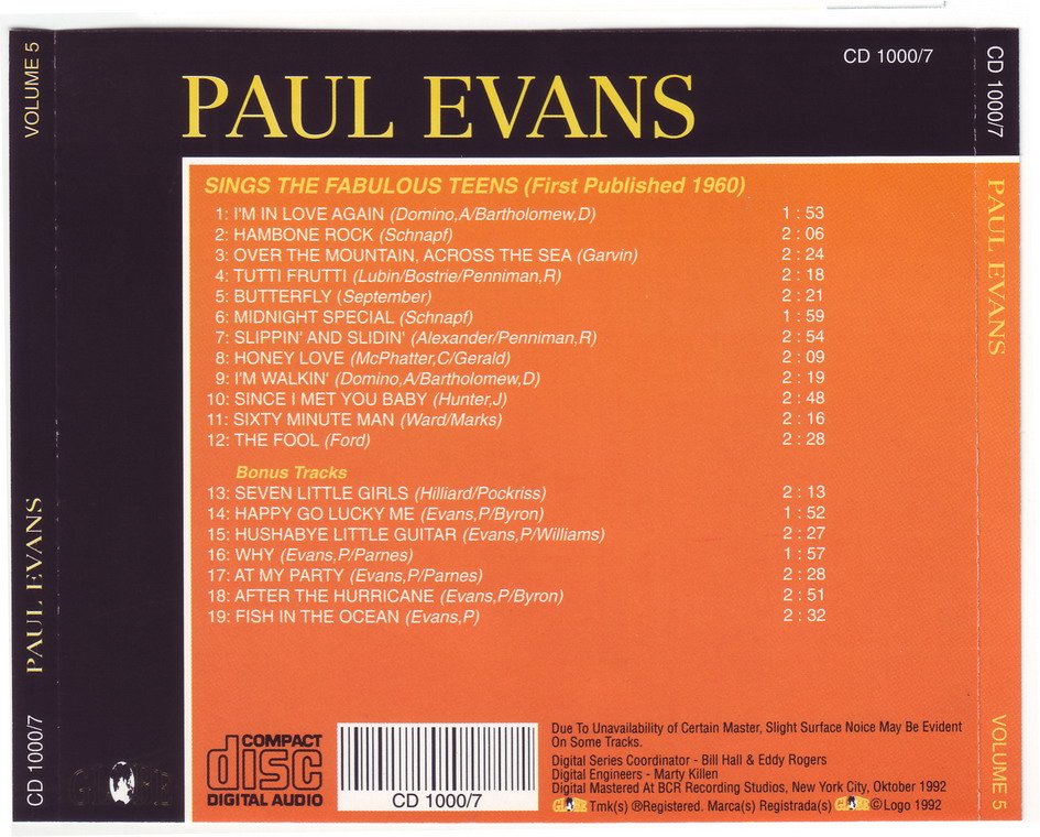 A retrospective CD of Paul's hits, "Paul Evans - the Fabulous Teens and Beyond " was released on Ace Records in the UK in 1995.