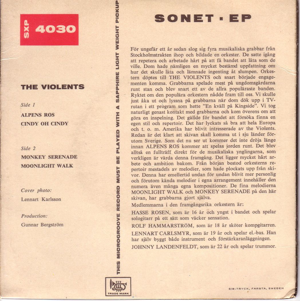 The Violents sind eine schwedische Gitarren-Gruppe die 1961 bereits mit ihrer ersten Single "Alpens Ros" voll eingeschlagen hat. Rolf Hammarström, Gitarre, und Lannart Carlsmyr, Gitarrenbass, fanden sich bereits 1959 und machten Skifflemusik. Etwas später stiessen der Schlagzeuger Tord Jonsby und der Gitarrist und Sänger Hasse Rosén zu ihnen, damit waren sie komplett. Auf Singles trat Hasse Rosén als Vokalist erst 1963 in Erscheinung. Viel bekannter wurden die Violents als Begleitband des schwedischen Sängers Jerry Williams.