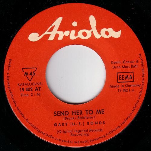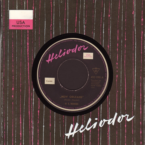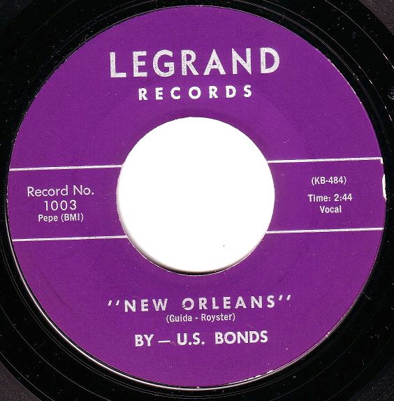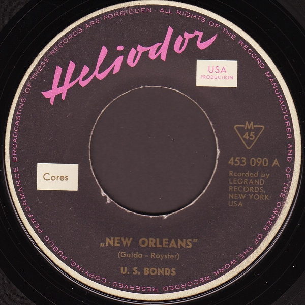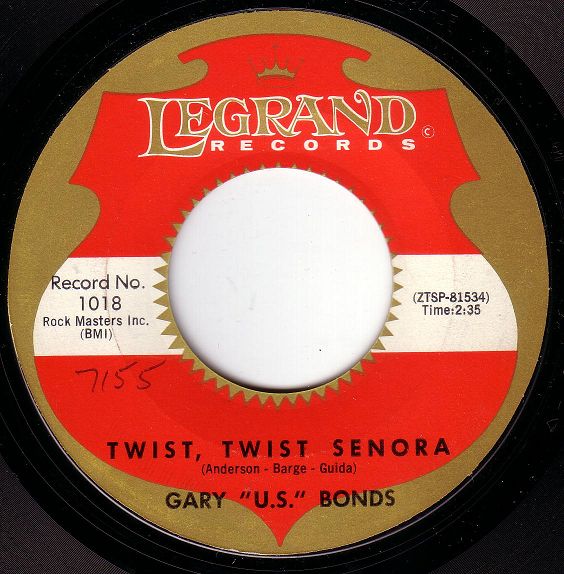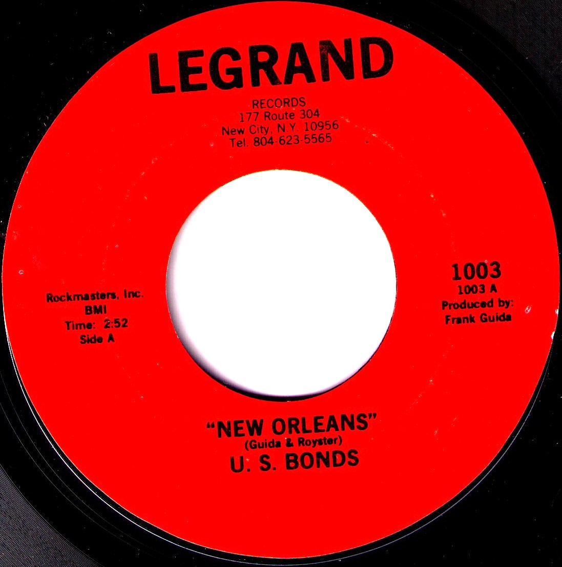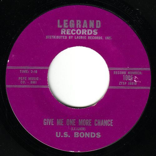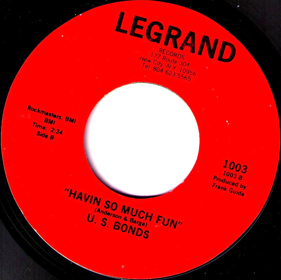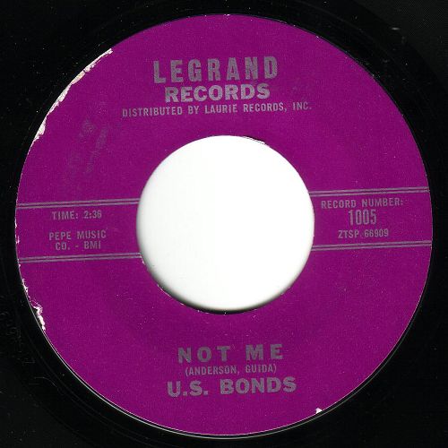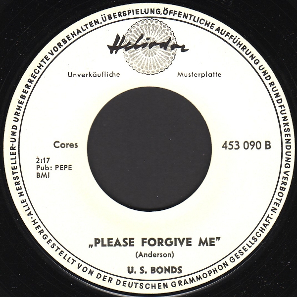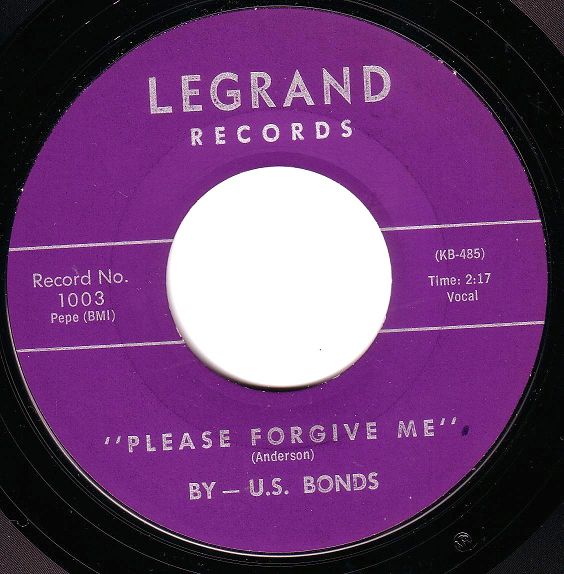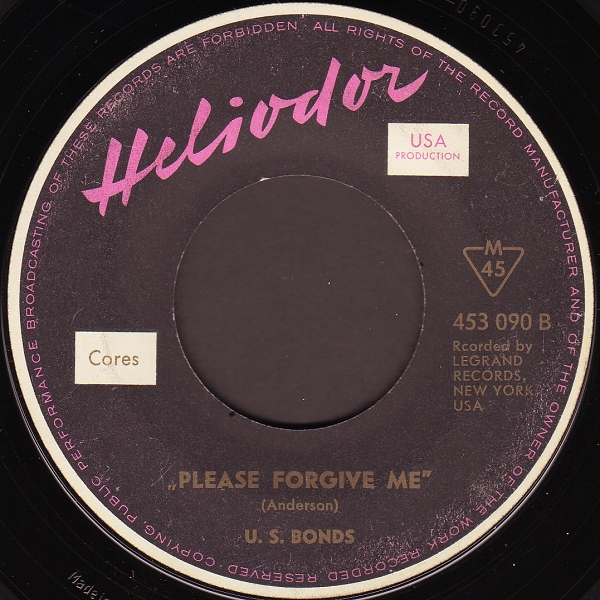 Ich wollte das "U" nicht so leer lassen und da ist mir U. S. Bonds eingefallen. Kein Fehler, nicht die U.S. Bonds. Darum hat Gary Anderson, geb. 6. Juni 1939 in Jacksonville, Florida, später seinen echten Vornamen vorgesetz um zu dokumentieren, dass er eine Person und nicht eine Musikgruppe ist. Seine erste Veröffentlichung "New Orleans" schlug auch bei uns sofort ein. Mir gefiel dieser Titel auch gut aber weil ich immer aus der Reihe tanzen muß, die Slow-Nummer "Please Forgive Me" gefiel mir noch weit besser. Das LEGRAND-Label hatte bei uns ein ähnliches Schicksal wie CAMEO/PARKWAY (z. B.: Chubby Checker), zuerst TOP RANK (ARIOLA) dann COLUMBIA (ELECTROLA) und dann wieder ARIOLA. Nur ganz am Anfang kam noch HELIODOR (DEUTSCHE GRAMMOPHON) dazu.