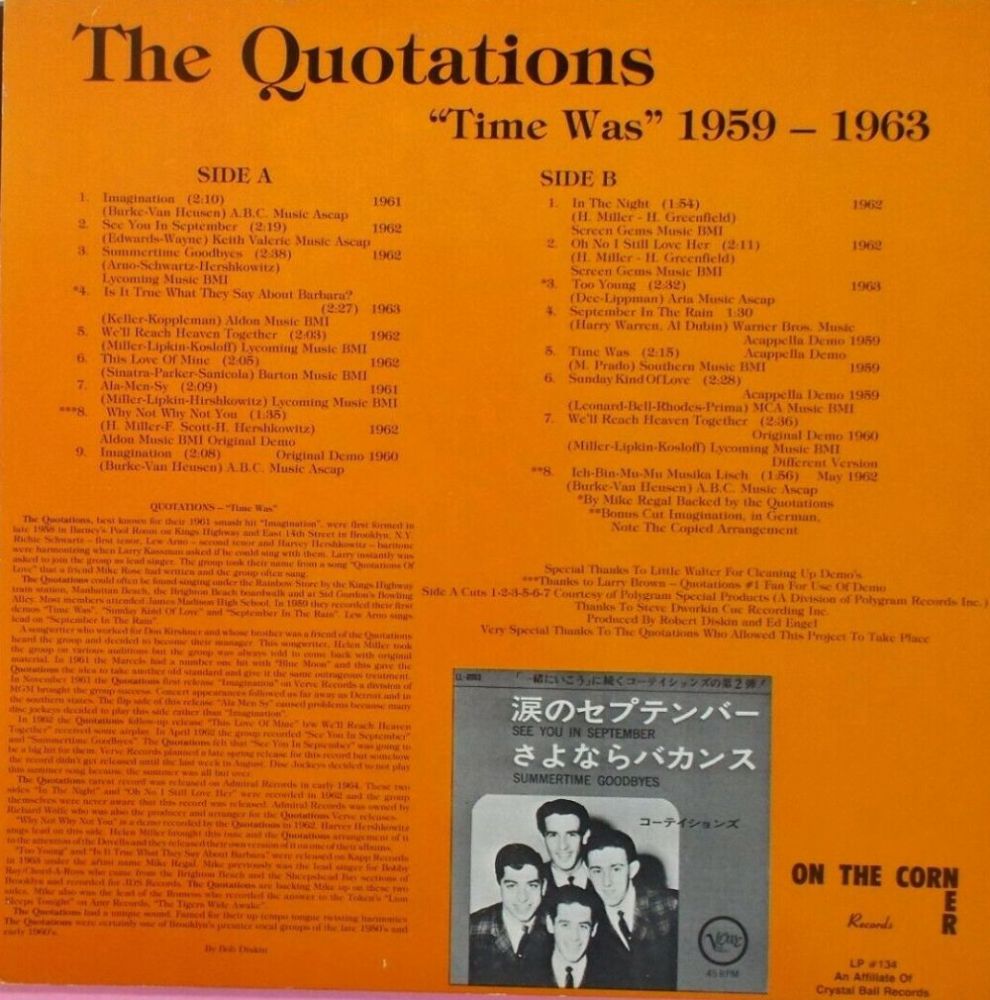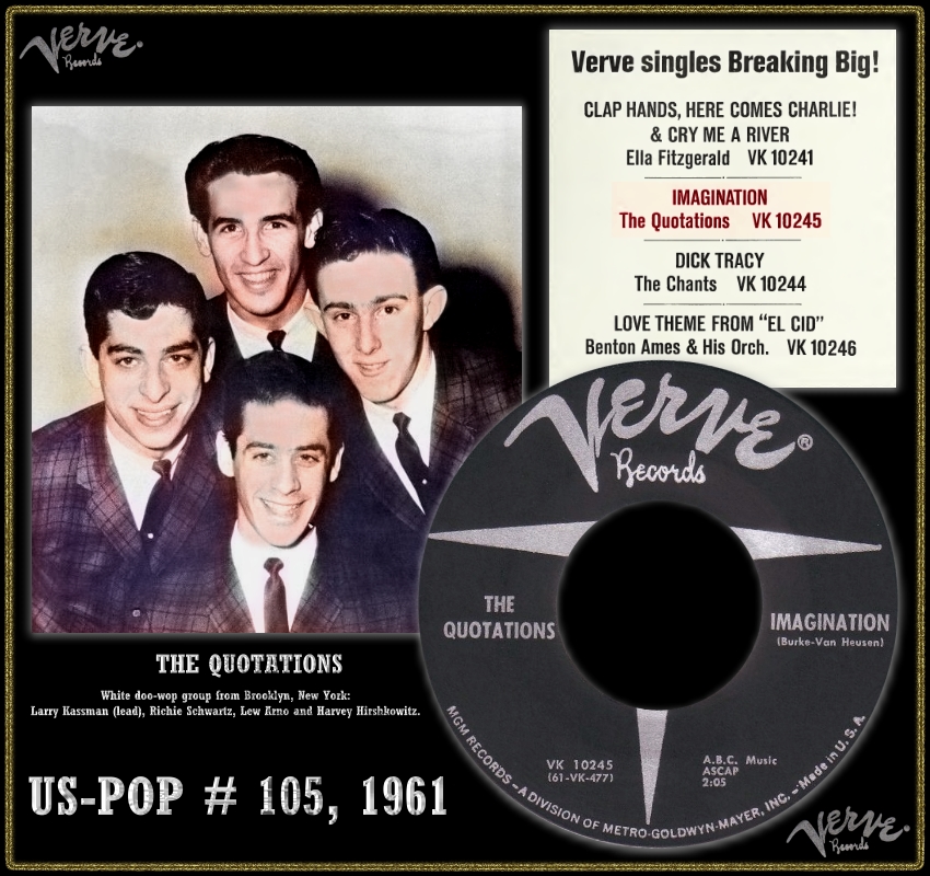 Die Quotations fanden sich 1958 in der James Madison High School in East *) Brooklyn, New York, zusammen und gründeten 1959 eine Doo-Wop-Band: Larry Kaye (ziviler Name: Larry Kassman), Lead; Richard Schwartz, erster Tenor; Lew Arno, zweiter Tenor und Harvey Hershkowitz, Bariton. 1961 trafen sie Helen Miller von M-G-M, die sie bei VERVE-Records unter Vertrag nahm. Ihre erste Single kam bereits in die Charts (bei Billboard "under the bubble 100", Platz 105).