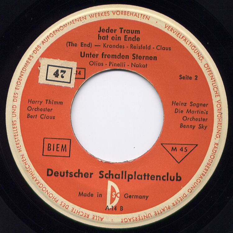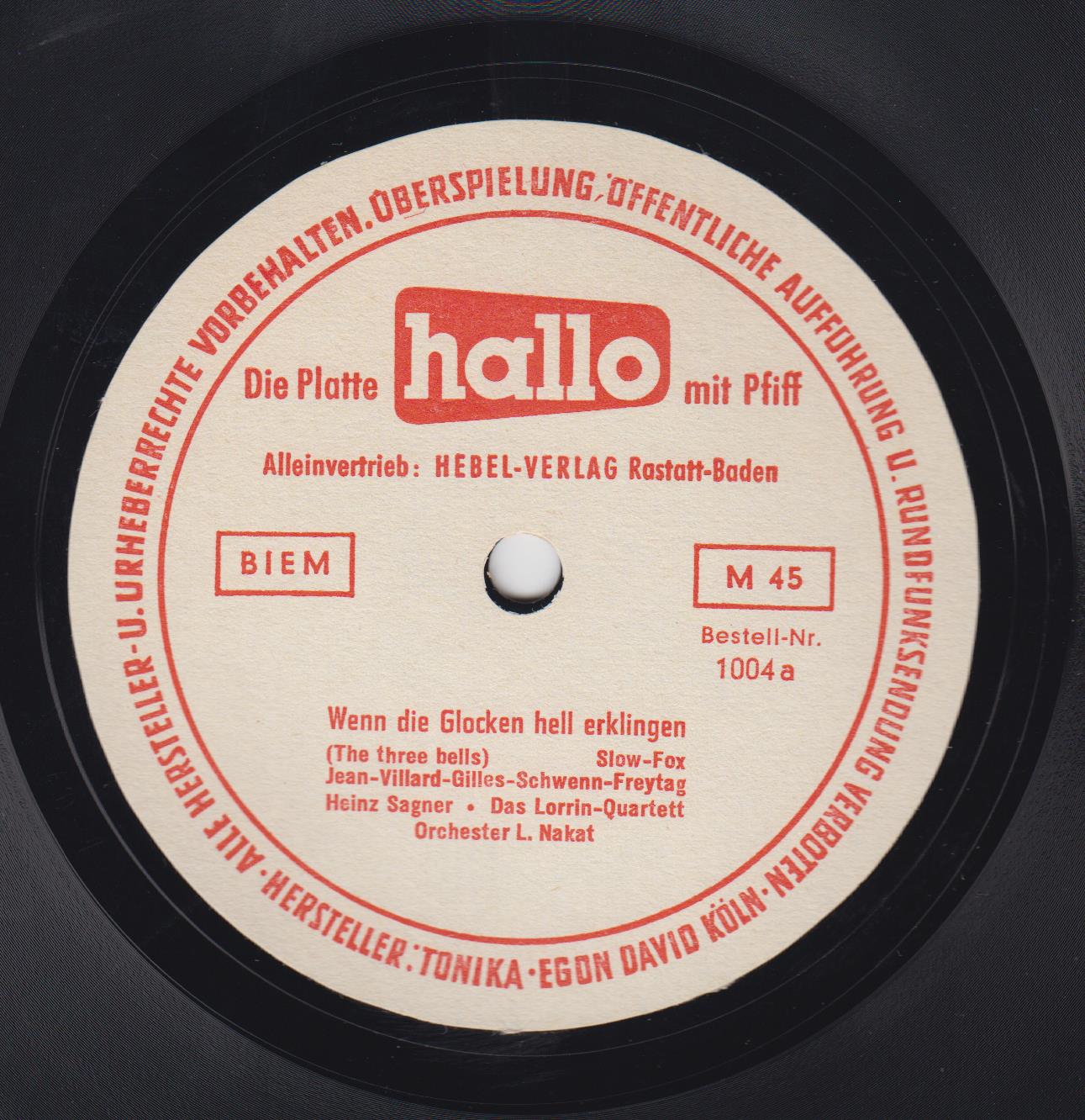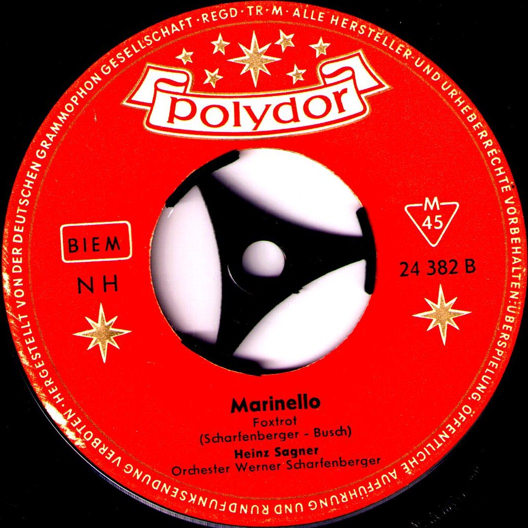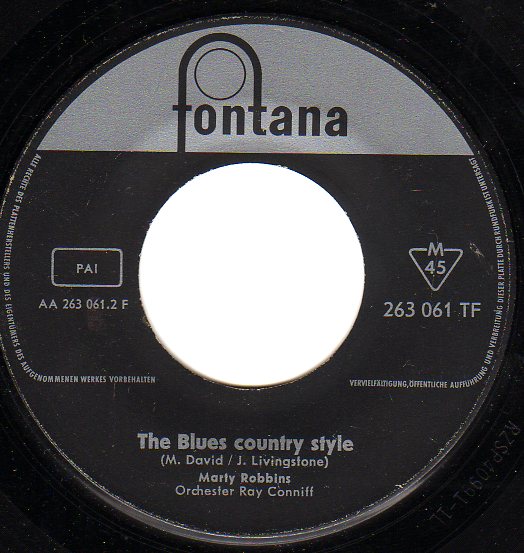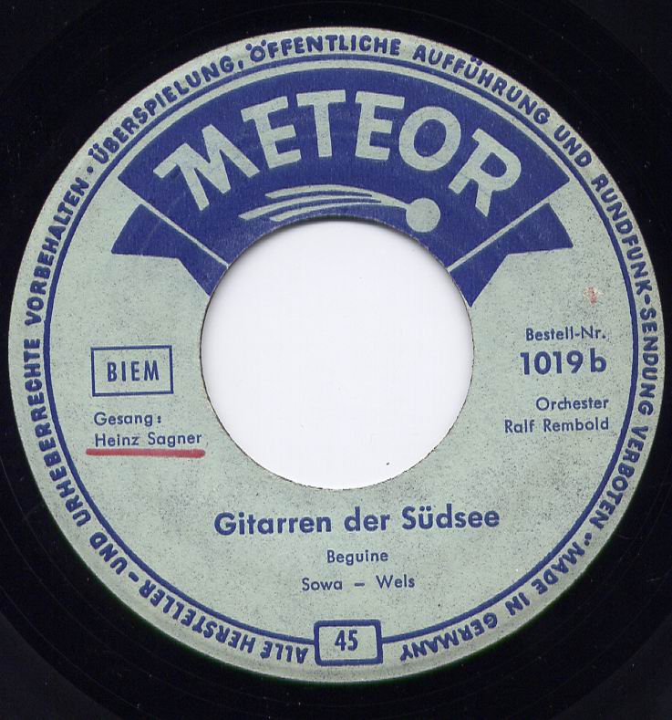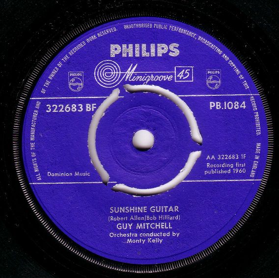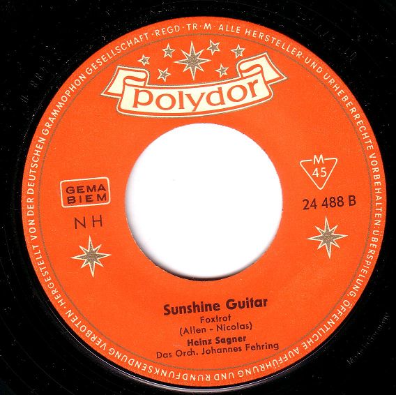 Hier eine wunderschöne deutsche Fassung von Guy Mitchell's "Sunshine Guitar" als B-Seite. Auf der A-Seite verdeutsch Heinz Sagner "Blues Country Style" von Marty Robbins. Hier fehlt mir leider (das ist unehrlich, denn ich bin kein Fan des 3/4-Taktes) die Original-Fassung. Wenn's einer hat ?