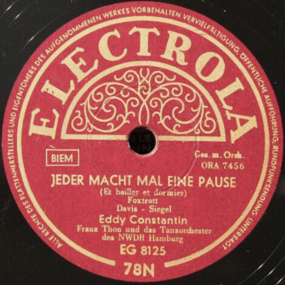 Eddie Constantine ist ein "Fressen" für Sammler und insbesondere für Forscher. Nicht nur, weil man den US-Amerikaner für einen Franzosen hielt, manche glauben es heute noch, sondern auch wegen seiner Platten-Aufnahmen die sich im Bereich des Chansons bewegen, eine Musikrichtung die mir nicht so sehr liegt, sie paßt auch nicht unbedingt hierher, aber Eddie ist ganz einfach anders. Lemmy Caution ist Lemmy Caution. Ich fasse seine Titel meist als gute Schlager auf und ich höre mir sie ganz gerne an aber das Nonplusultra ist eindeutig "Jeder macht mal eine Pause". Ich finde diese Fassung von der Instrumentierung her musikalisch einfach grandios. Aber dieser Titel wurde auch forscherisch mein "Waterloo", das ich erst wieder heute von mir abschütteln konnte. Ich war ganz stolz als ich seinerzeit herausfand, dass es sich um eine Coverversion des US-Titels "I'm Gonna Sleep With One Eye Open" von Alan Dale (Musik: Jeff Davis, Text: Mitchell Parish) handelt. Gegen Eddie ist diese Aufnahme leicht zu vergessen. Ich habe mich aber immer gewundert warum bei der deutschen Fassung in Klammer "Et bailler et dormir" steht. Heute habe ich meinen großen Irrtum entdeckt. Eddie sang diesen Titel mit einem Text von Charles Aznavour auf französisch, aber bereits 1953 (französische MERCURY N° 10012), Alan Dales Aufnahme stammt jedoch aus dem Jahre 1955. Also hat bereits Alan Dale gecovert und Eddie hat dann nach ihm die deutsche Version seines eigenen Titels kreiert. Der Autor Jeff Davis klingt so englisch, aber es dürfte sich doch um einen Franzosen handeln. Nun die Original-Version aus dem Internet und das bis heute vermeintliche Original mit Cover