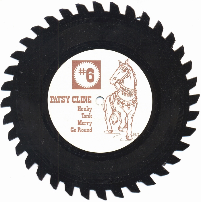 Singles sind nicht immer aus schwarzem Vinyl. Aber sie sind auch nicht immer rund. Die folgende Repro-Scheibe wurde vermutlich 1986 hergestellt, sieht aus wie das Sägeblatt einer Kreissäge und spielt tadellos. Das Vergnügen wird noch größer, denn drauf ist ein starker Country Song von Patsy Cline aus 1955. Wer von euch hat ähnlich obskures in seiner Sammlung?